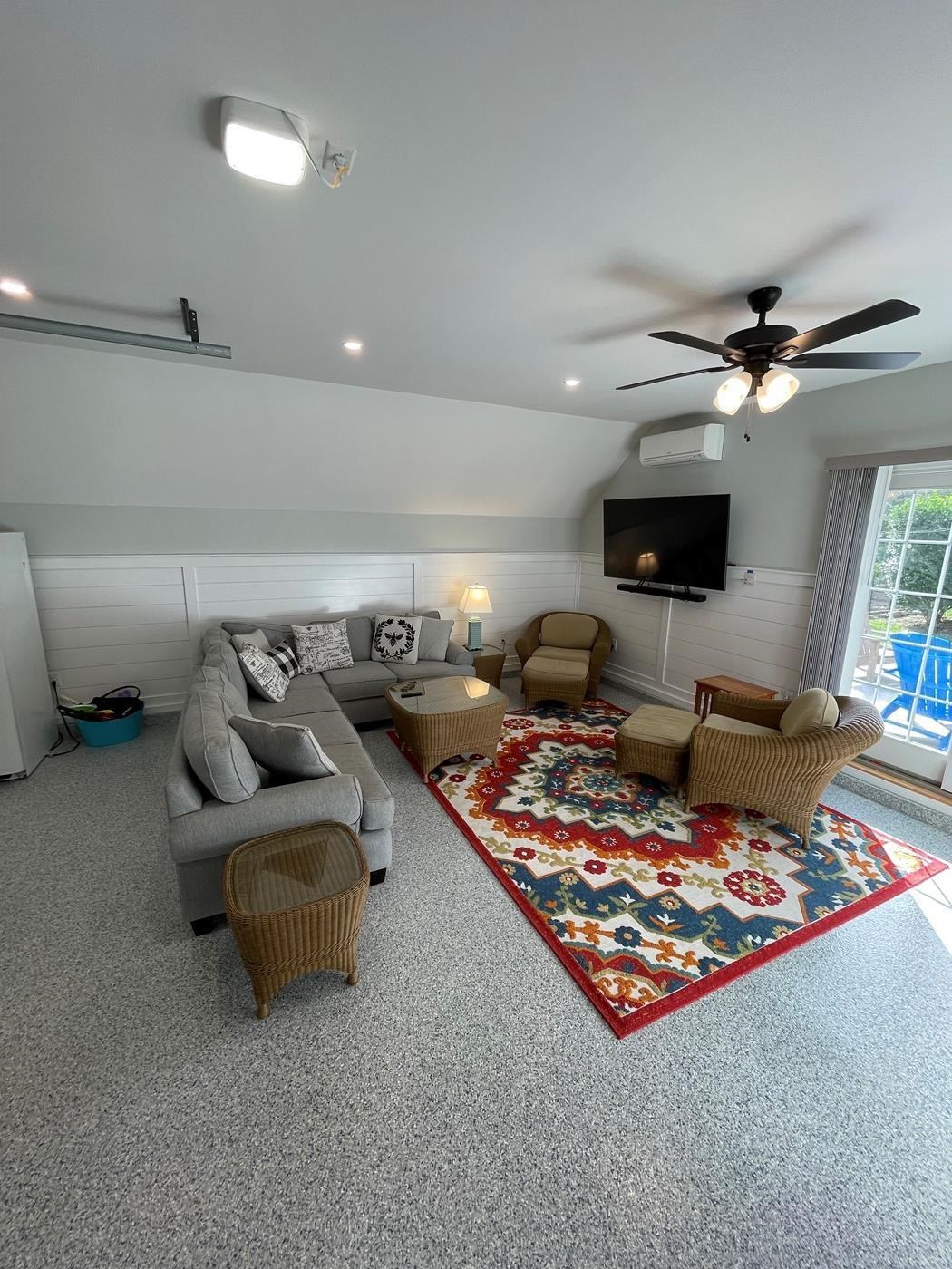 Garage/bonus room with 65” Smart TV, mini-split AC & sectional