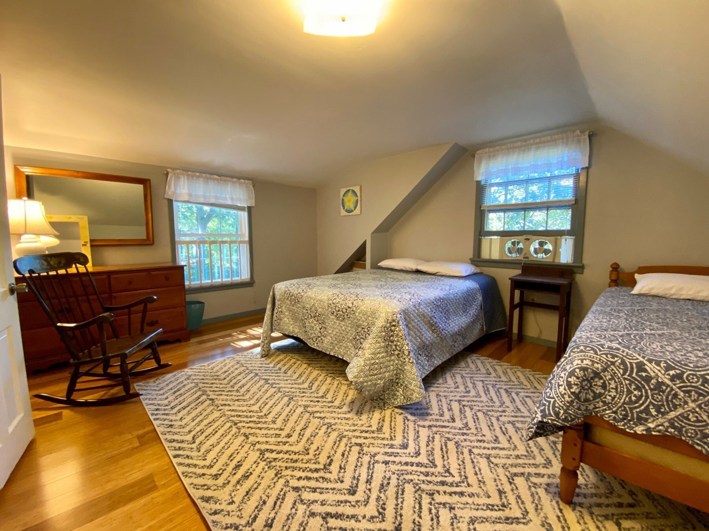 The first floor features a bright, well-stocked kitchen, a welcoming dining area, and a spacious living room with comfortable seating for eight—perfect for gathering after a day in the sun. Also on this level are a convenient half bath, a primary bedroom with a queen bed, and a second bedroom with a full-sized bed. Upstairs, you’ll find a full bath and two additional bedrooms, each offering a queen and twin bed, ideal for families or groups. Every bedroom, along with the kitchen, dining, and living areas, is cooled by air conditioning for your comfort.