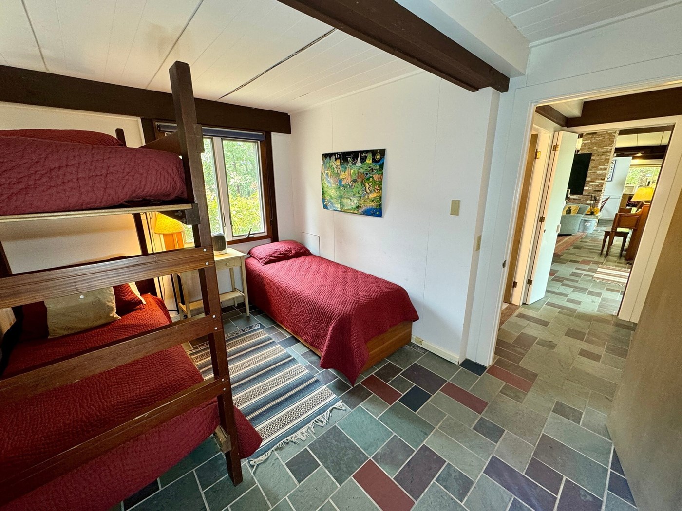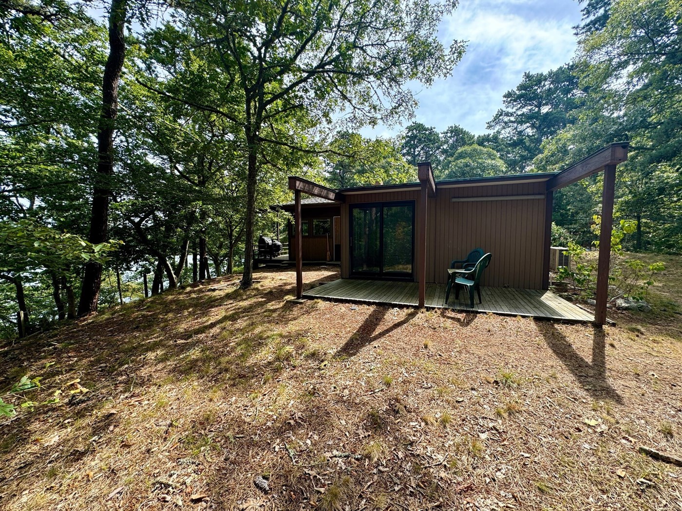 Situated on four acres, with an expansive deck overlooking the pond, this house has four bedrooms inside, plus an attached bunkhouse.