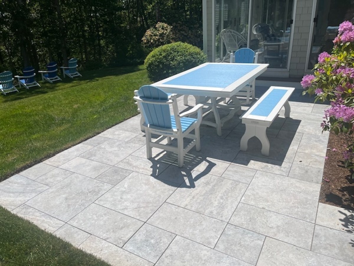Beautiful stone patio overlooking pond.