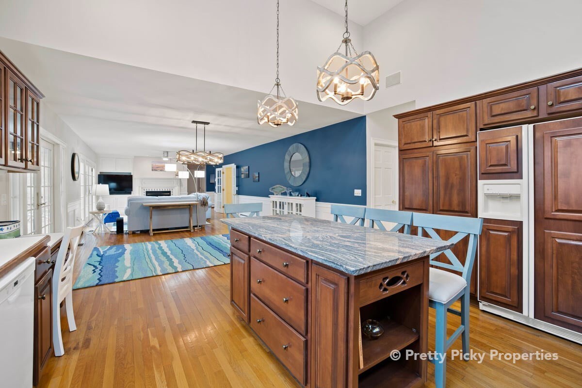 Beautiful kitchen with center island and counter seating. Note skylight and windows for a bright, cheery impression.