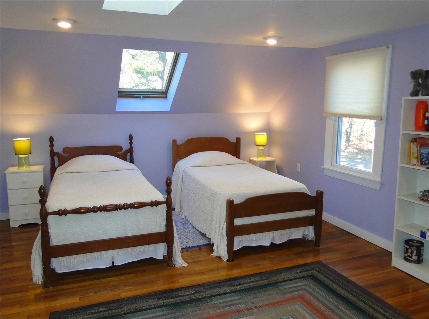 The master bedroom is on the first floor and is separated from the main living area with a front hall and entrance area; it has a king bed, full bathroom with laundry, and large sitting area with vaulted ceilings and skylights. From this sitting area, French doors open onto the deck and gardens. The second floor has two bedrooms and one full bathroom. The upstairs bedrooms are large and bright, each has two skylights. One bedroom has a queen bed; the other has a queen bed and a pair of twin beds. Cotton linens and towels are provided for your convenience. <br />