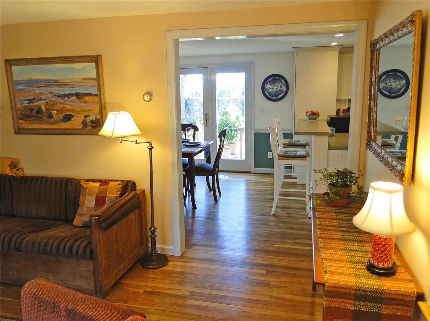 The kitchen is well stocked; It has a dishwasher, refrigerator, coffee maker, electric water kettle, gas range and oven, utensils, and cookware. Adjacent to the kitchen is a breakfast counter with barstool seating. The dining room has French doors opening onto a fully furnished deck with a gas grill. The living room has plenty of seating and a flat screen TV. The library/den has a desk and a couch. Central AC/heat and WIFI are available throughout the house. <br />