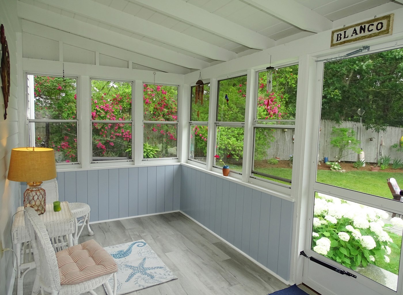 Pass through sliding glass doors from the dining area into the three-season porch with a dining table and seating area. This is a cozy spot to enjoy a meal or relax and take in the views of the backyard, with mature trees and lush plantings.