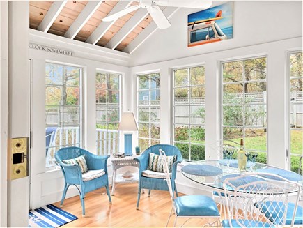 Sunroom with seating and small dining area. Offers easy access to deck - 58 Longs Lane Chatham Cape Cod New England Vacation Rentals