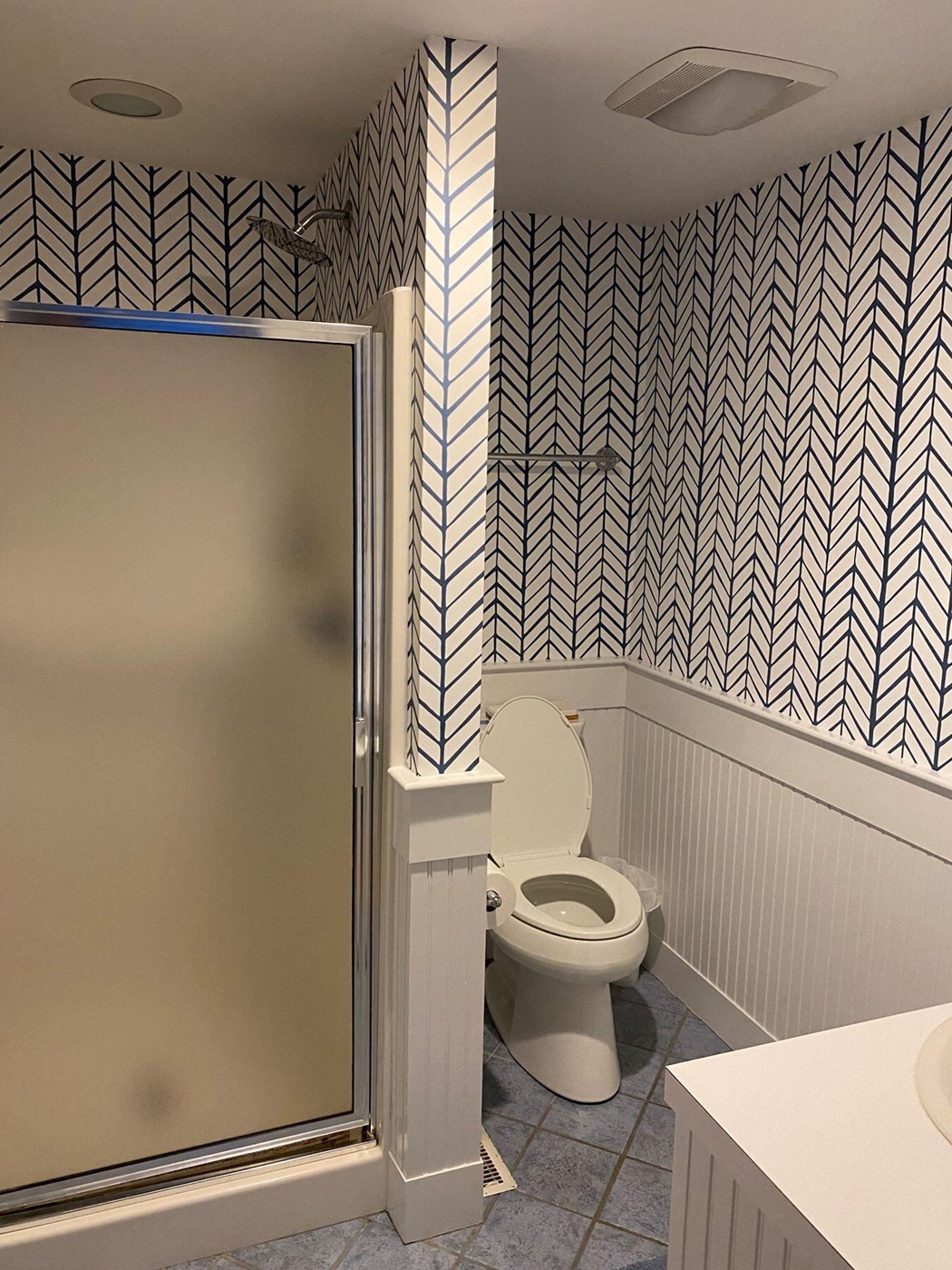 Fun wall paper and nautical hues continued in Bathroom #2 - 58 Longs Lane Chatham Cape Cod New England Vacation Rentals