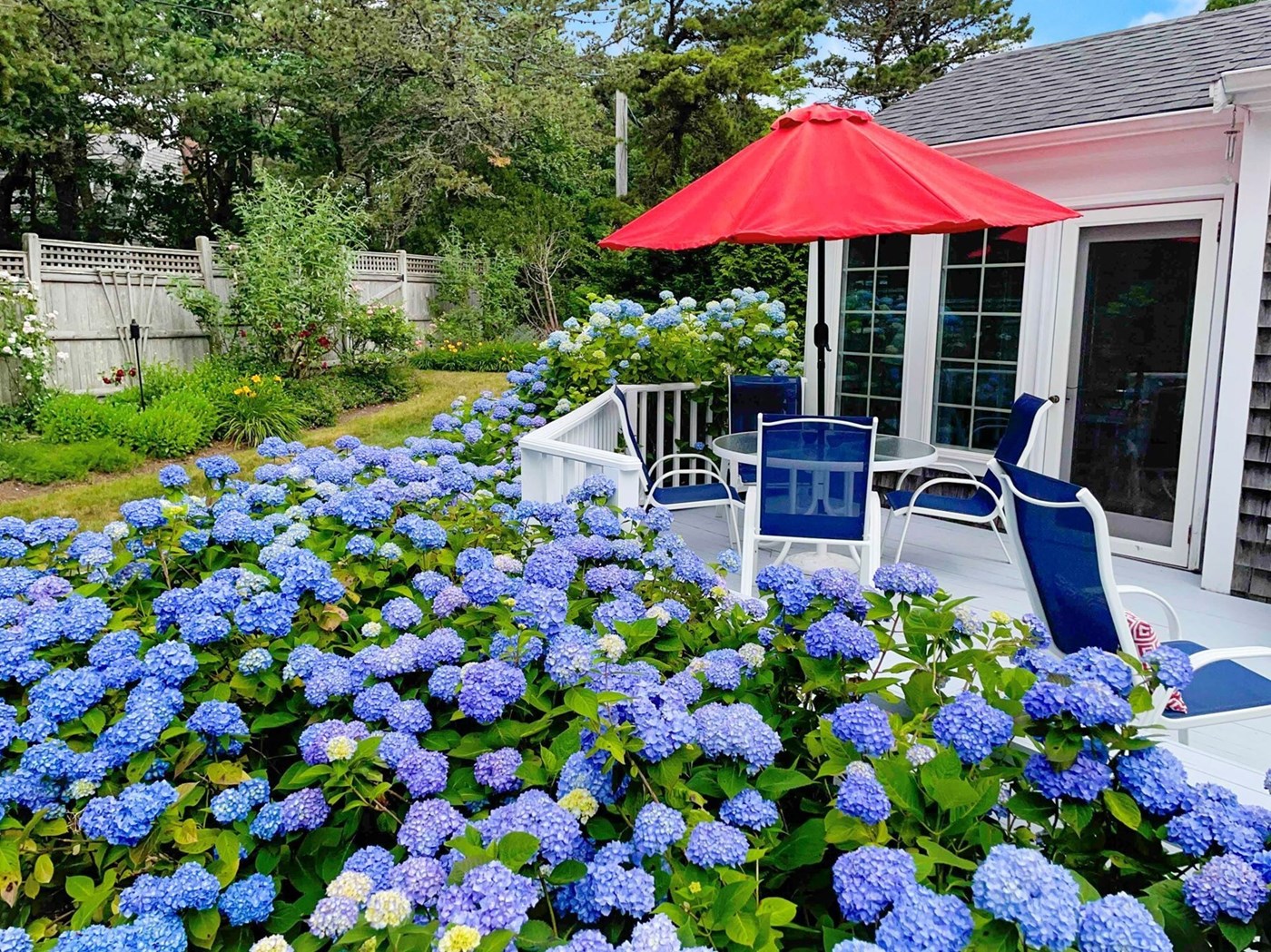 Blooming Hydrangeas surround you on the deck - 58 Longs Lane Chatham Cape Cod New England Vacation Rentals