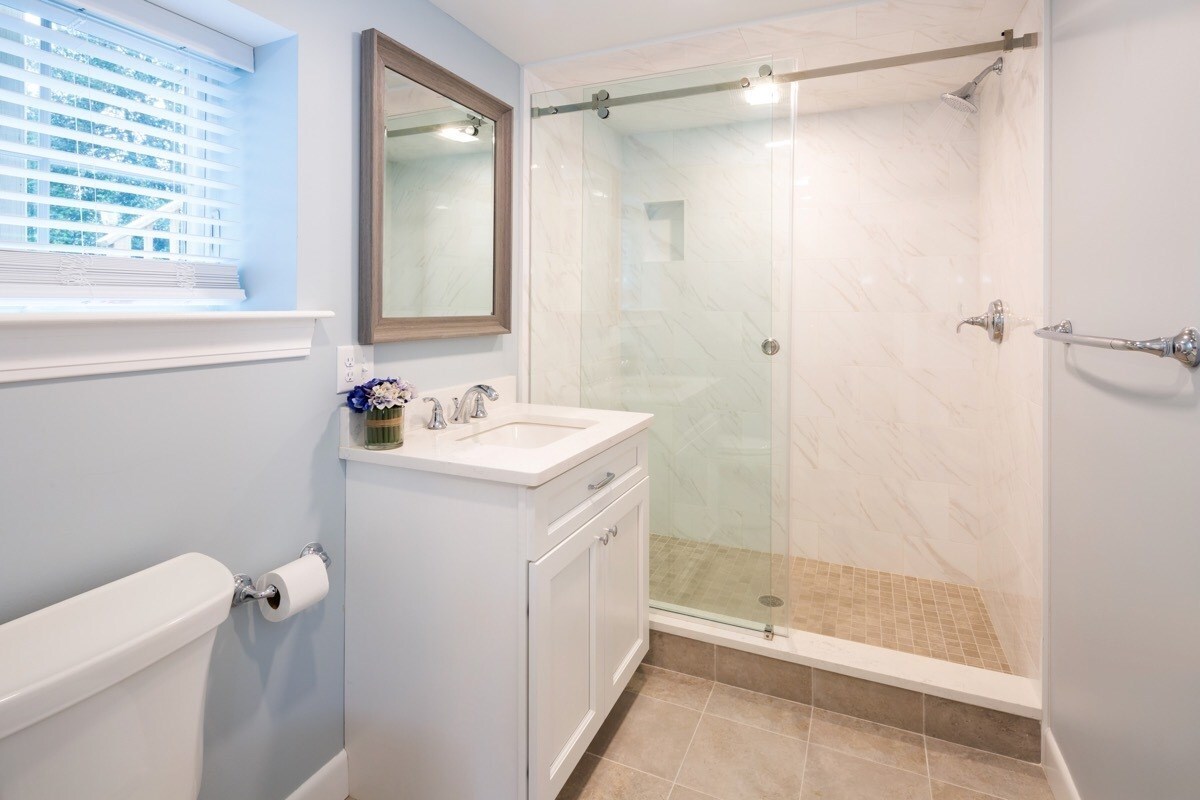 The primary bath has a sizeable tile and glass shower along with a custom vanity