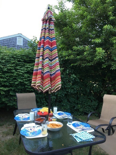 Sunny large yard with gas grill, dining table and chairs
