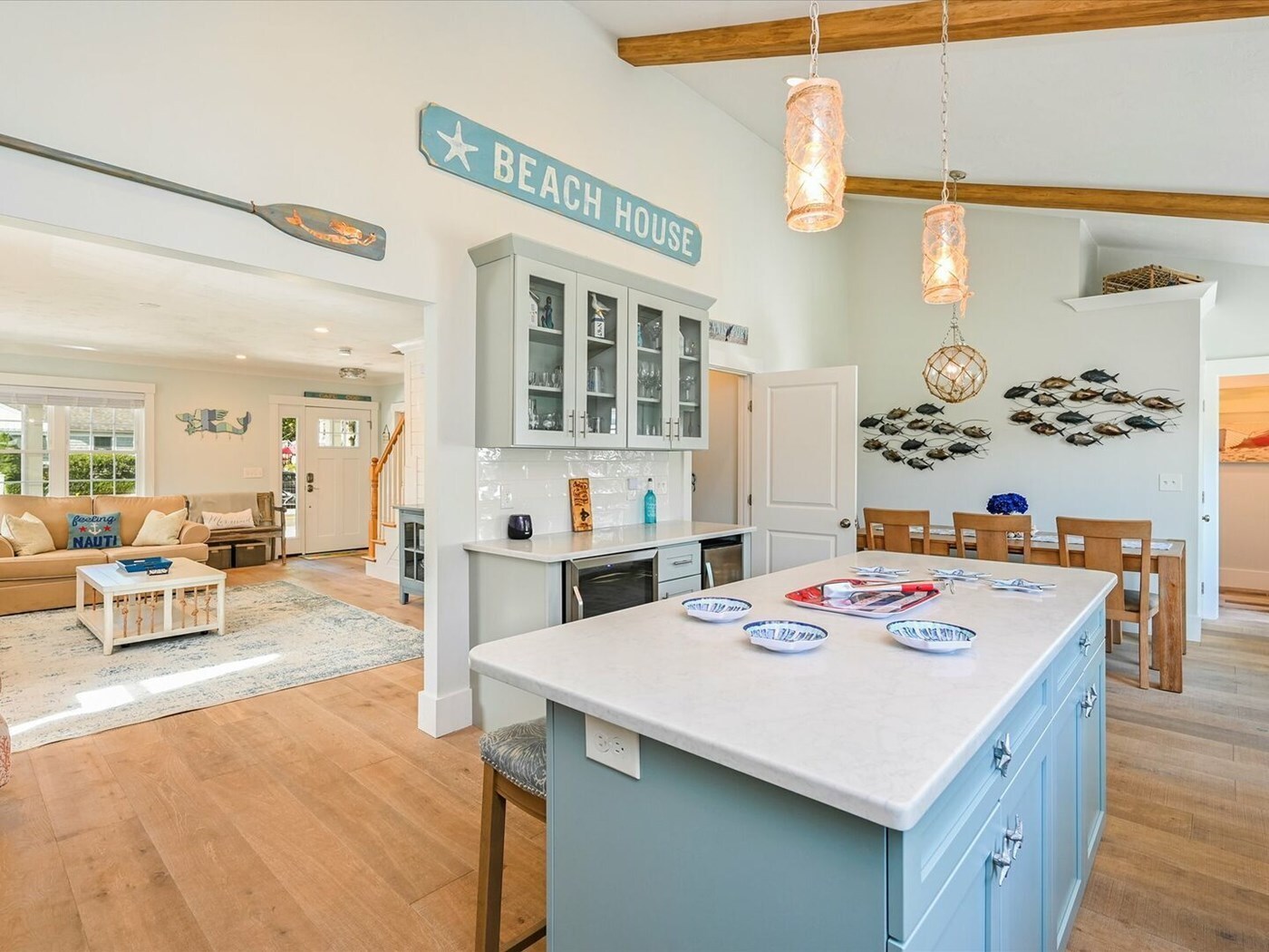 *Just beyond the living area is the gourmet kitchen, thoughtfully designed for both entertaining and family meals. It features glass-front cabinets, quartz countertops, a large center island with seating for four, and a separate wet bar with wine fridge and ice maker. Stainless steel appliances, a large ceramic farmhouse sink, and a 5-burner gas cooktop make cooking a breeze. The space is anchored by a farmhouse-style dining table with bench seating, highlighted by nautical-inspired lighting.<br />