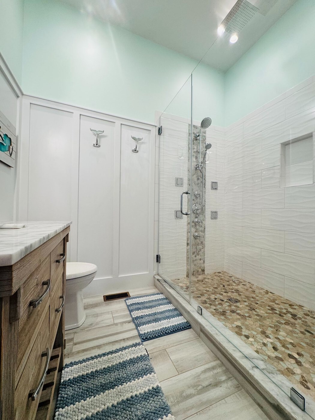 *Back inside, to the left of the family room, is Bedroom #1, featuring a king-sized bed and sliding barn door leading to a private en-suite bathroom with a large tiled shower, built-in seat, and oversized rain shower head.<br />