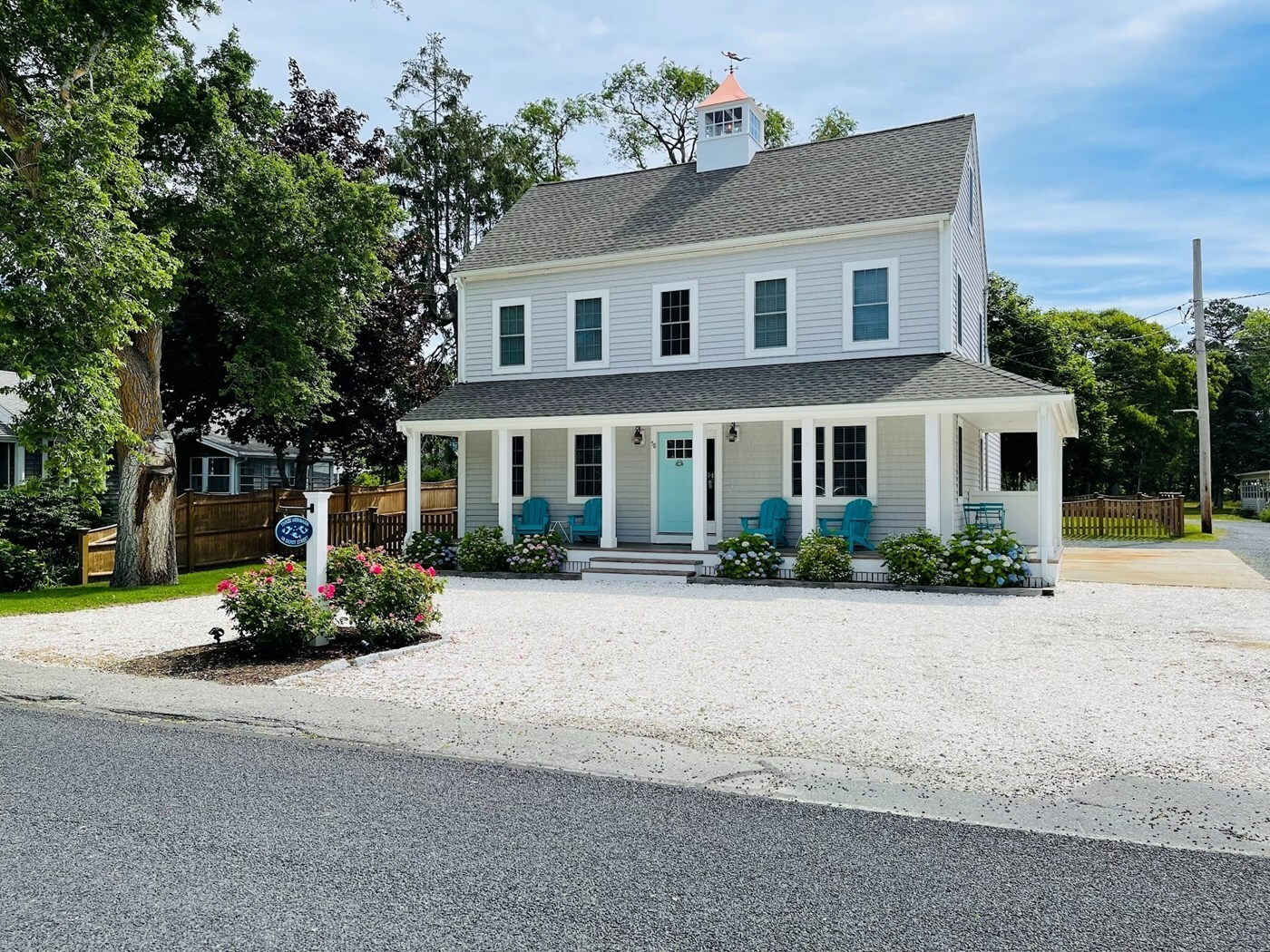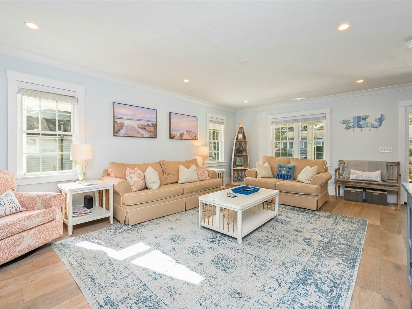 *Step onto the large porch, complete with teal Adirondack chairs and a bistro table—an inviting spot to enjoy morning coffee or unwind with an evening cocktail. From there, enter into a bright open-concept living space, beautifully styled with relaxed coastal flair. Wide-plank, pickled wood floors run throughout the home, setting the tone for easy Cape living.<br />