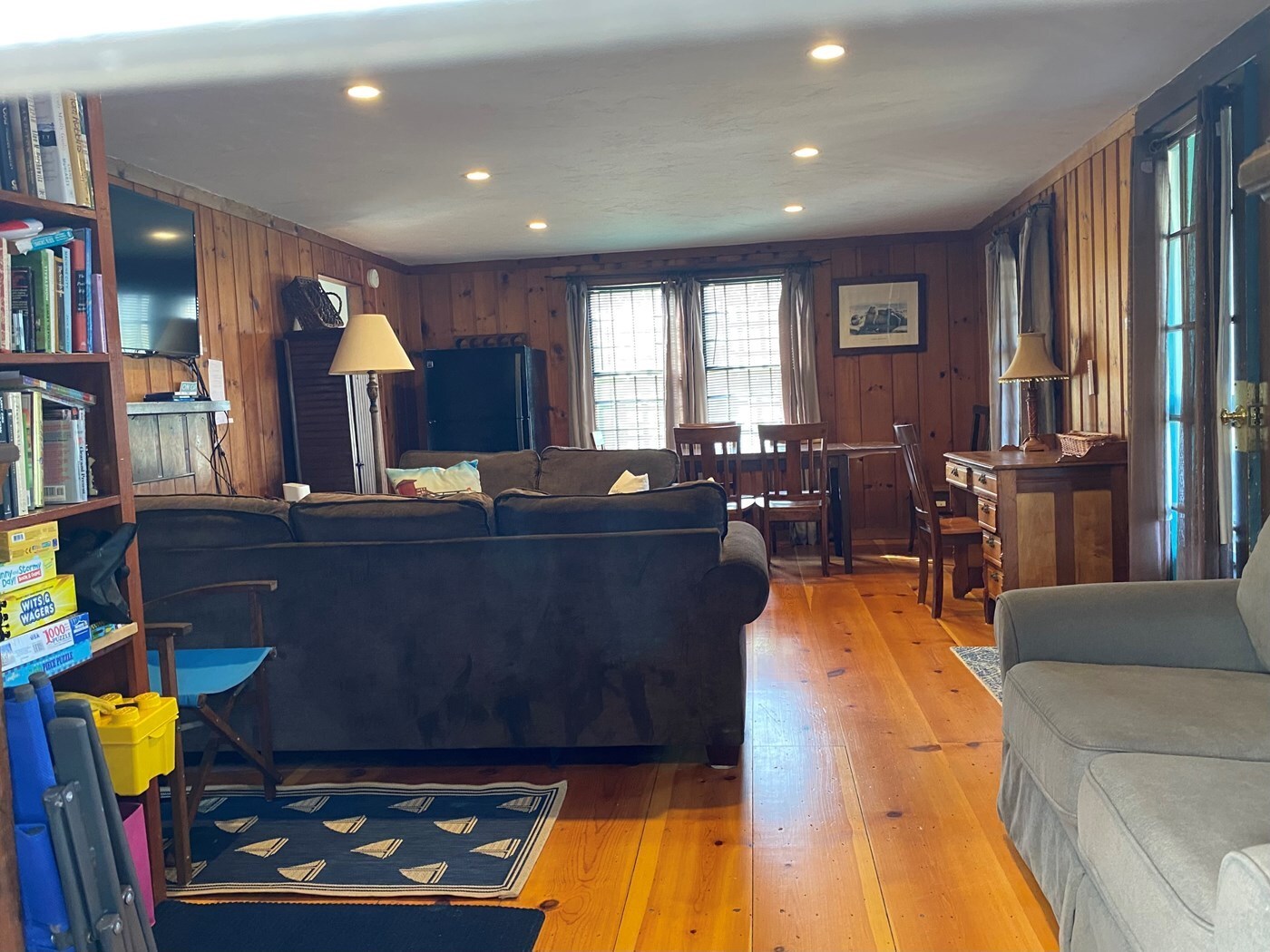 A 26’ living room/dining area on 1st floor, plus kitchen , bath, and small den with sofabed. On second floor, a large glass family shower in bath+ 3 bedrooms, one w/King, one w/a Queen + a Twin, and one w/2 Twins.