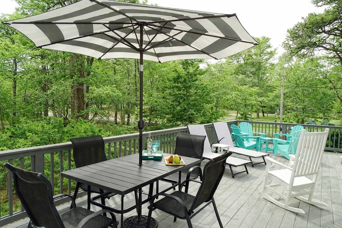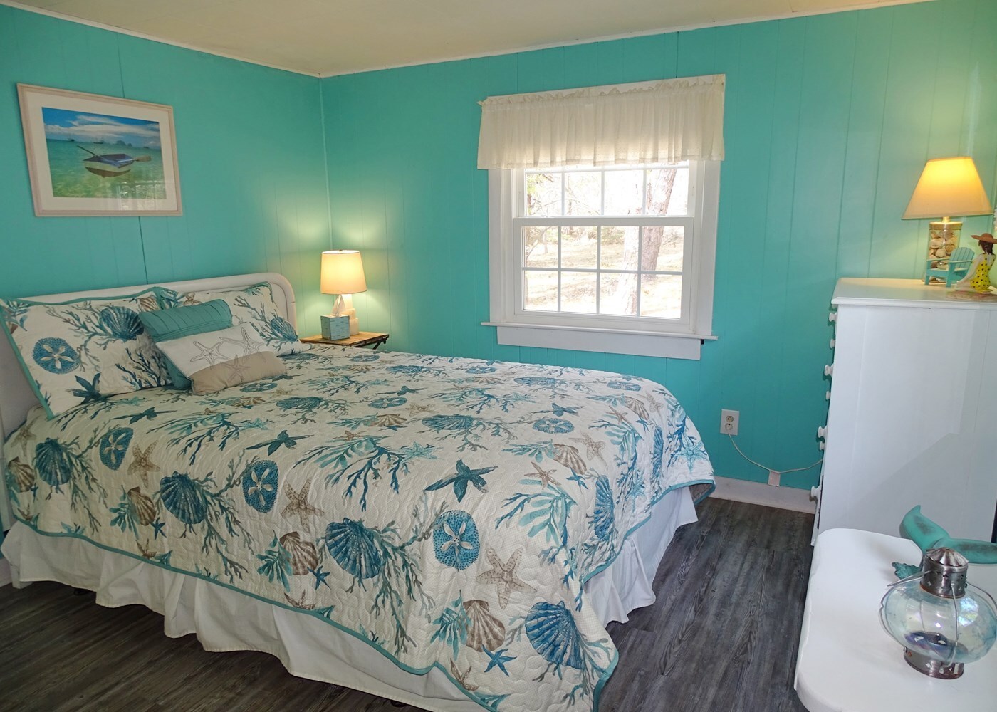 Bright, clean, and well maintained, the cottage has a well appointed kitchen, flat screen TV, AC units, wifi and an upgraded cable package. A comfortable sectional sofa complements the living area. There is an extensive wraparound deck with plenty of seating, gas grill and Adirondack chairs. Nearby is a spacious outdoor shower.