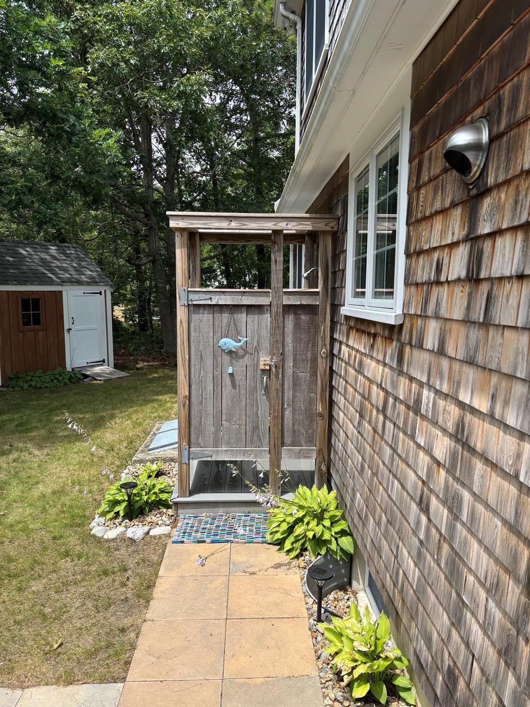 Deck with table, chairs and BBQ overlooking sizable yard.