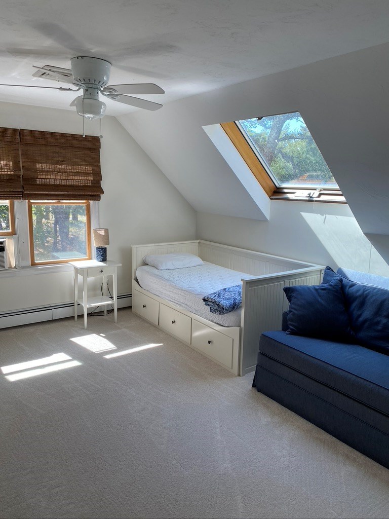 Head up the plush-carpeted stairs to find two peaceful bedrooms and a full bathroom. One room has a queen bed, the other two twins. Each includes closet space and a dresser. Beds are topped with lightweight quilts that are swapped and sanitized between guests, along with mattress pads and pillow protectors—because cleanliness and comfort matter.<br />