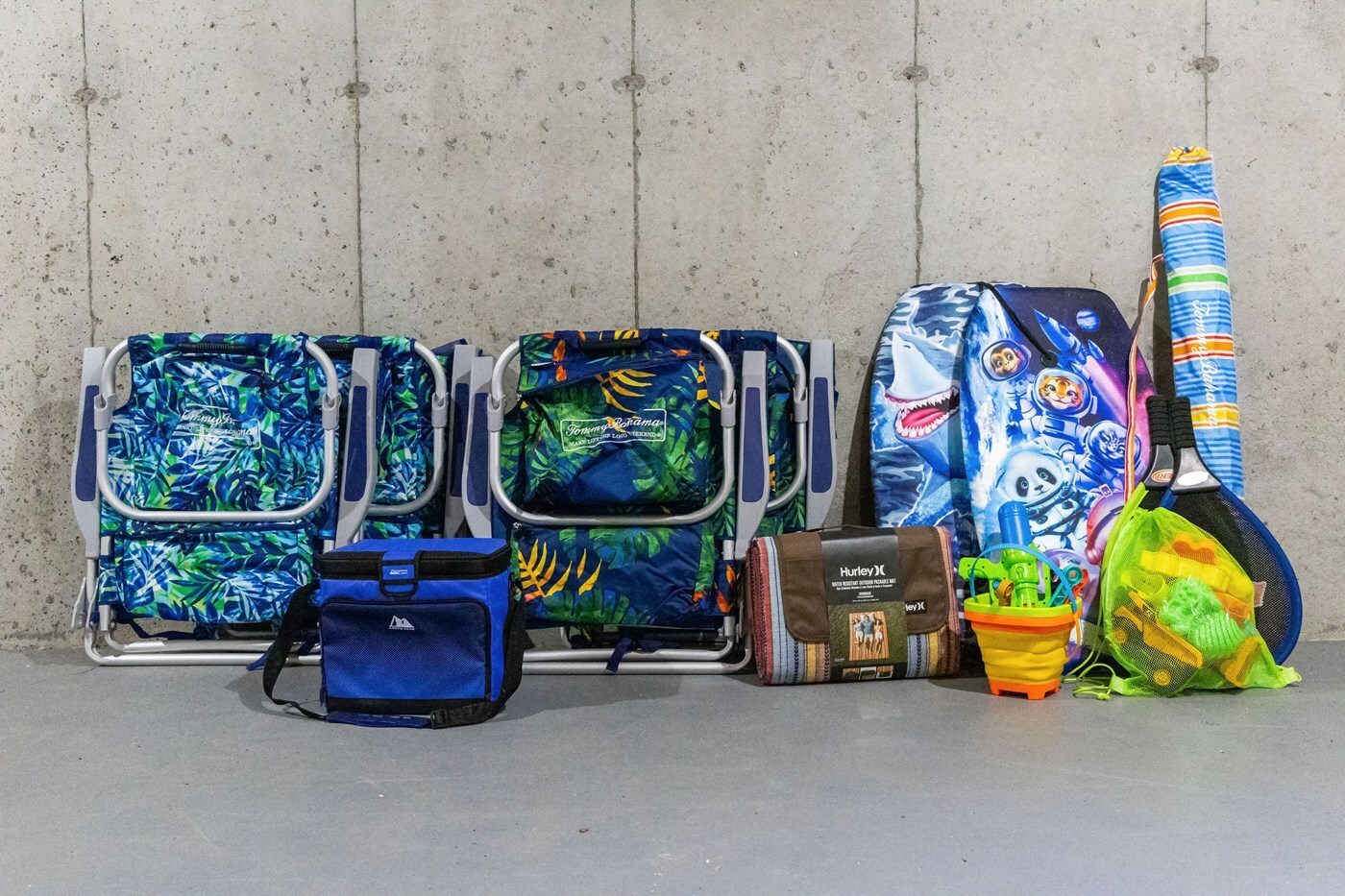 Beach chairs, umbrella, boogie boards, cooler, and beach toys