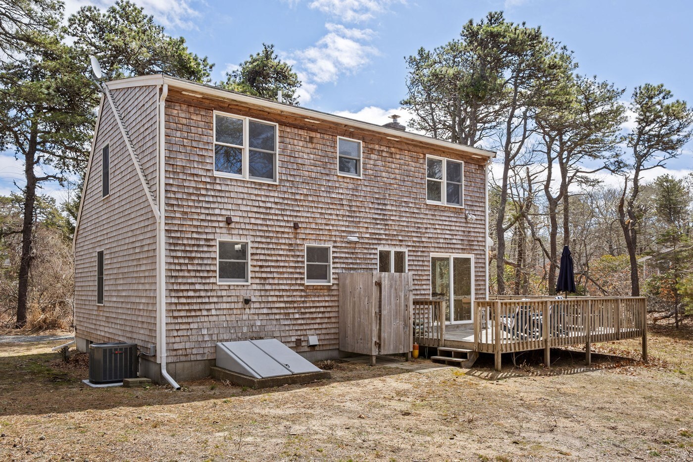 Backyard with wrap-around deck and outdoor hot/cold shower