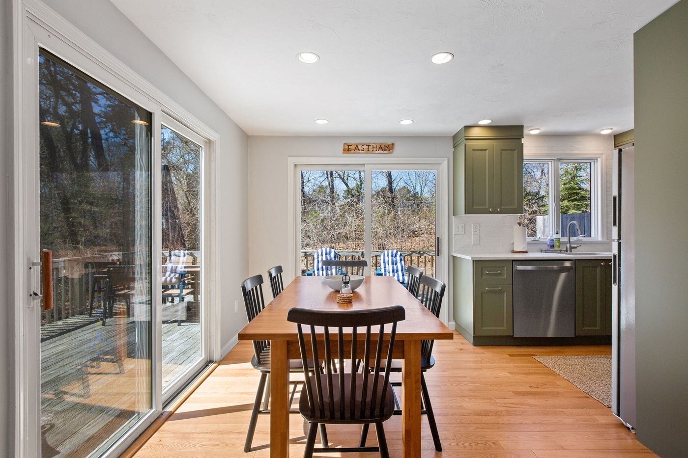 Dining area with two sliders to outdoor deck