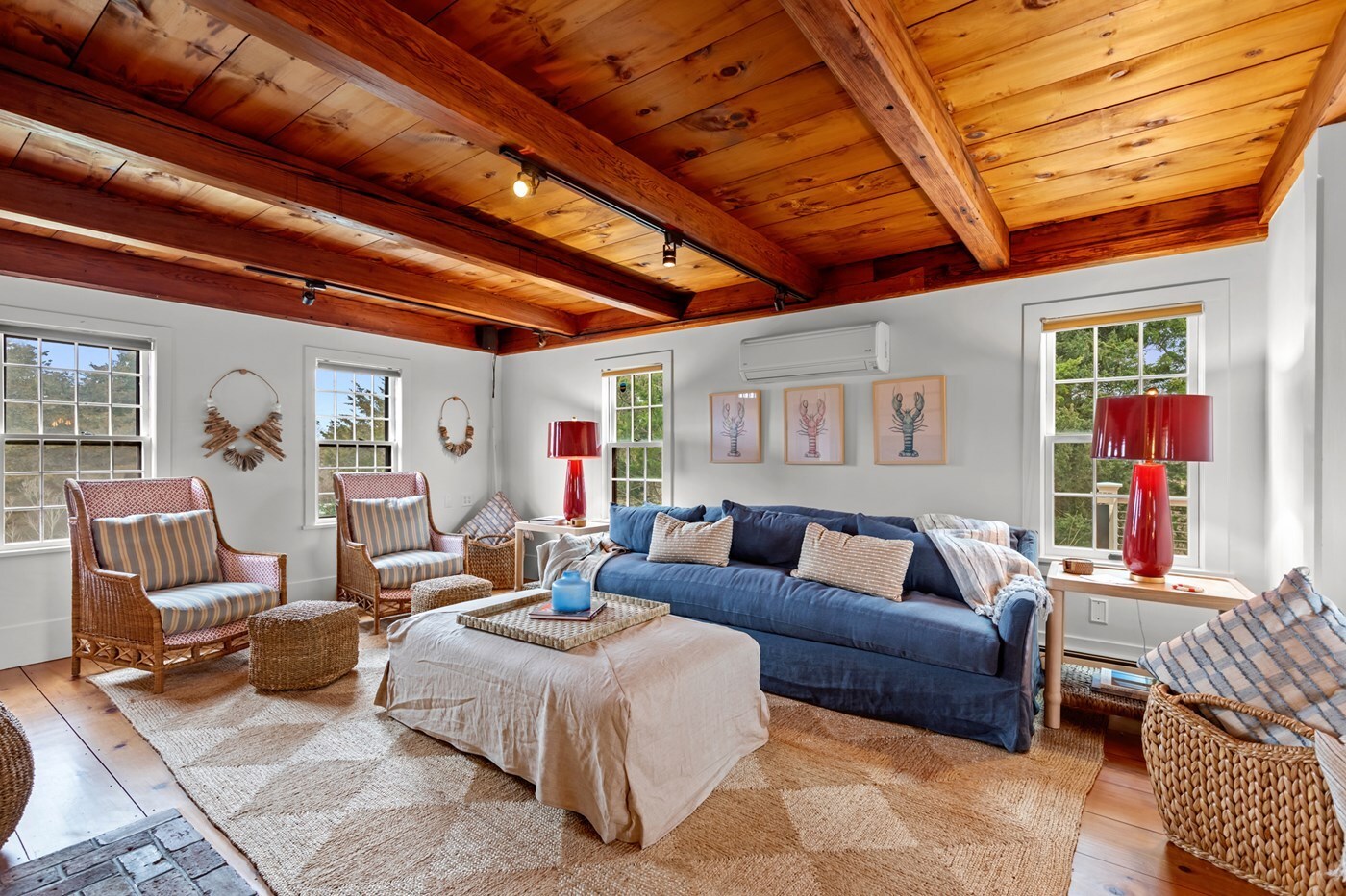 Warm and welcoming living room with dramatic wood beam ceilings
