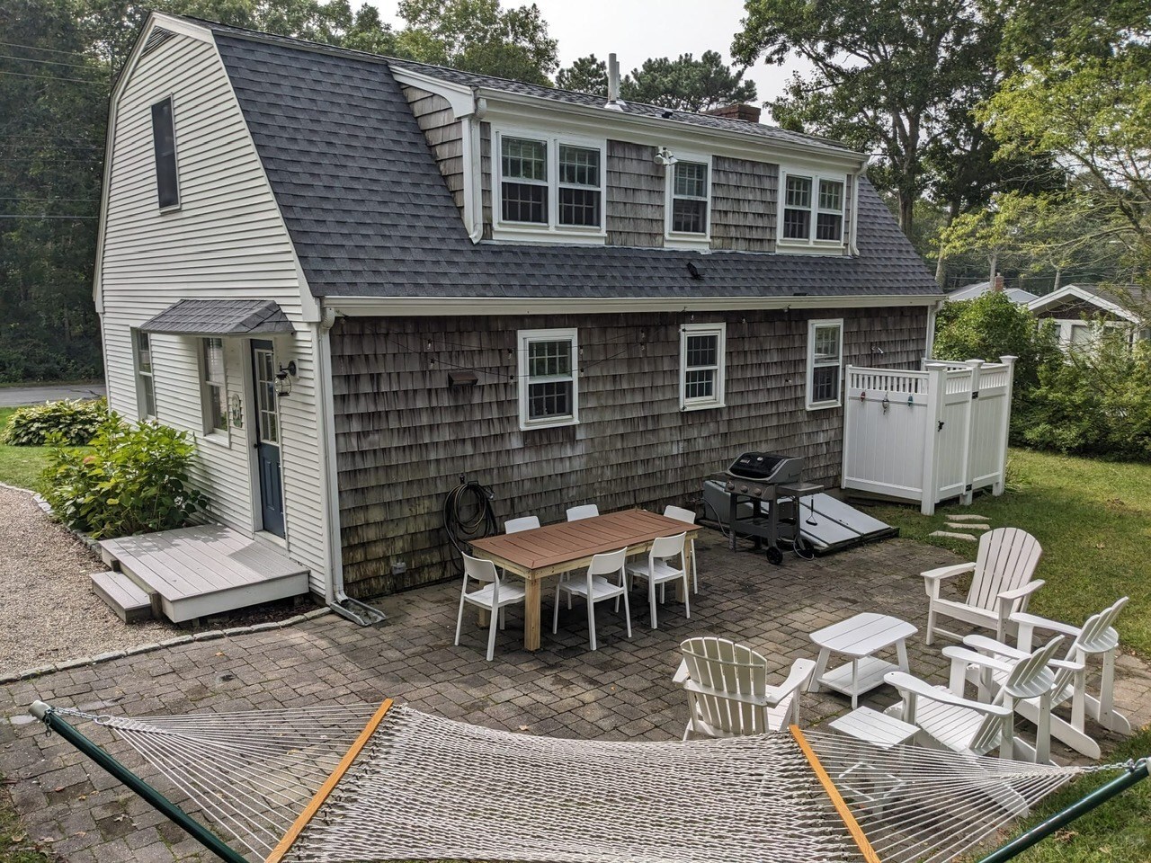 (no dealing with annoying propane tanks). The large patio out back has a dining table with seating for 8, as well as several Adirondack chairs and a large hammock for lounging. Store your bikes or beach gear in our spacious shed.<br />