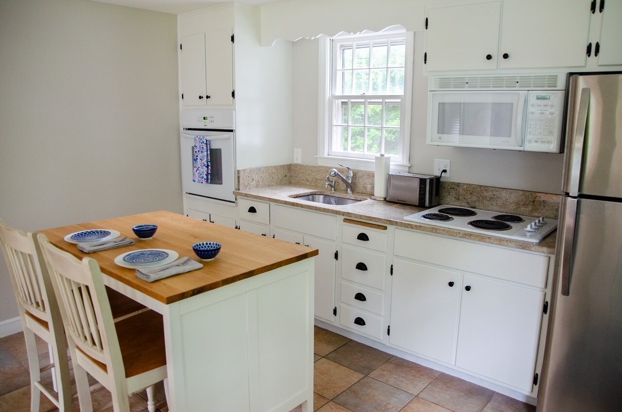 Our classic Cape house has two levels: the main floor with kitchen, dining room, living room, Queen bedroom and one full bath. Upstairs are two additional large bedrooms and a second full bath. Plus central AC to keep you cool!<br />
