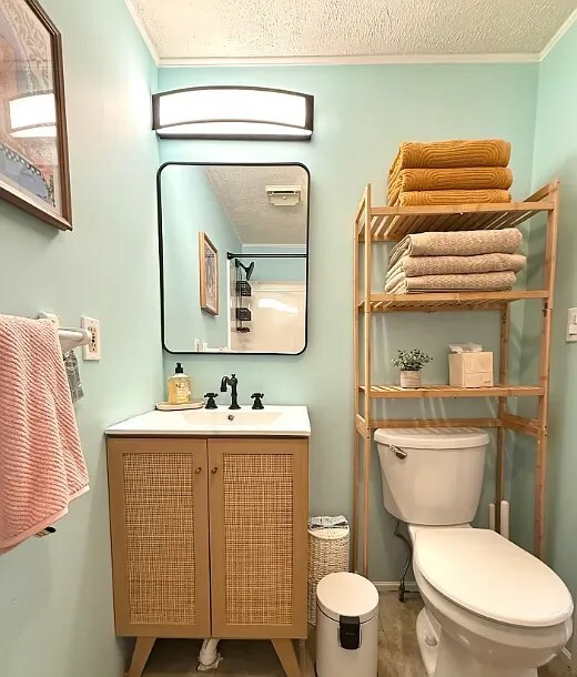 Full bath with modern fixtures, towels, and toiletries