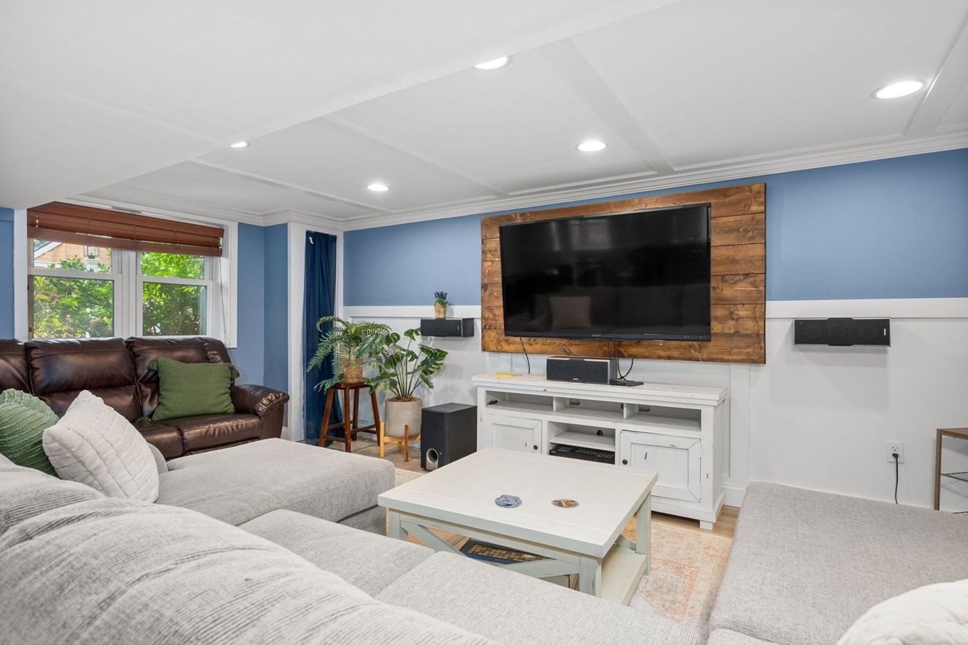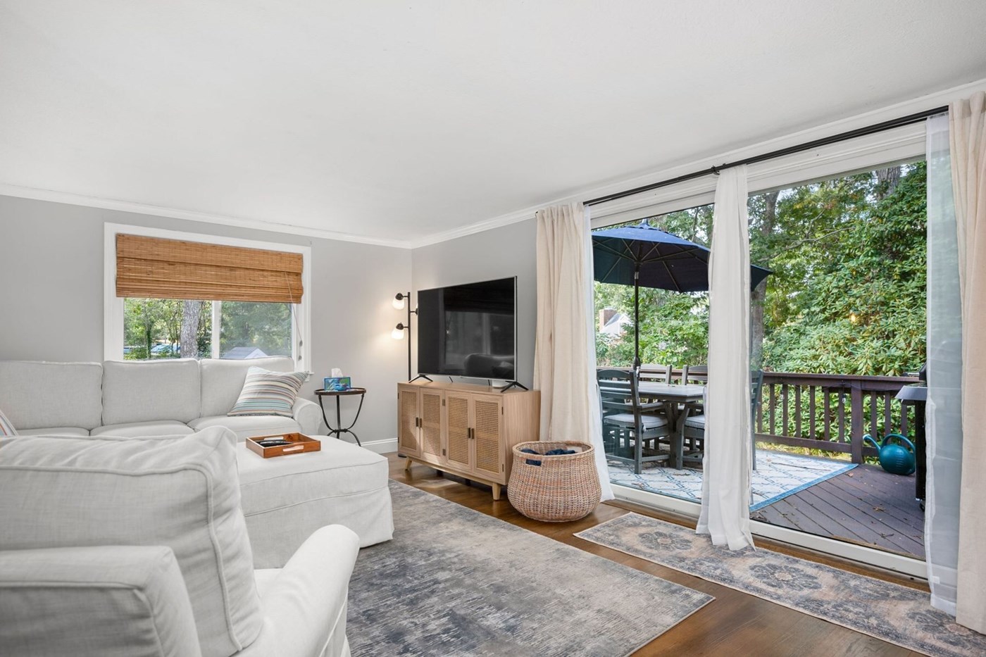 Nearby living room offers easy access to the deck and a comfortable space within which you can gather together to watch your favorite content