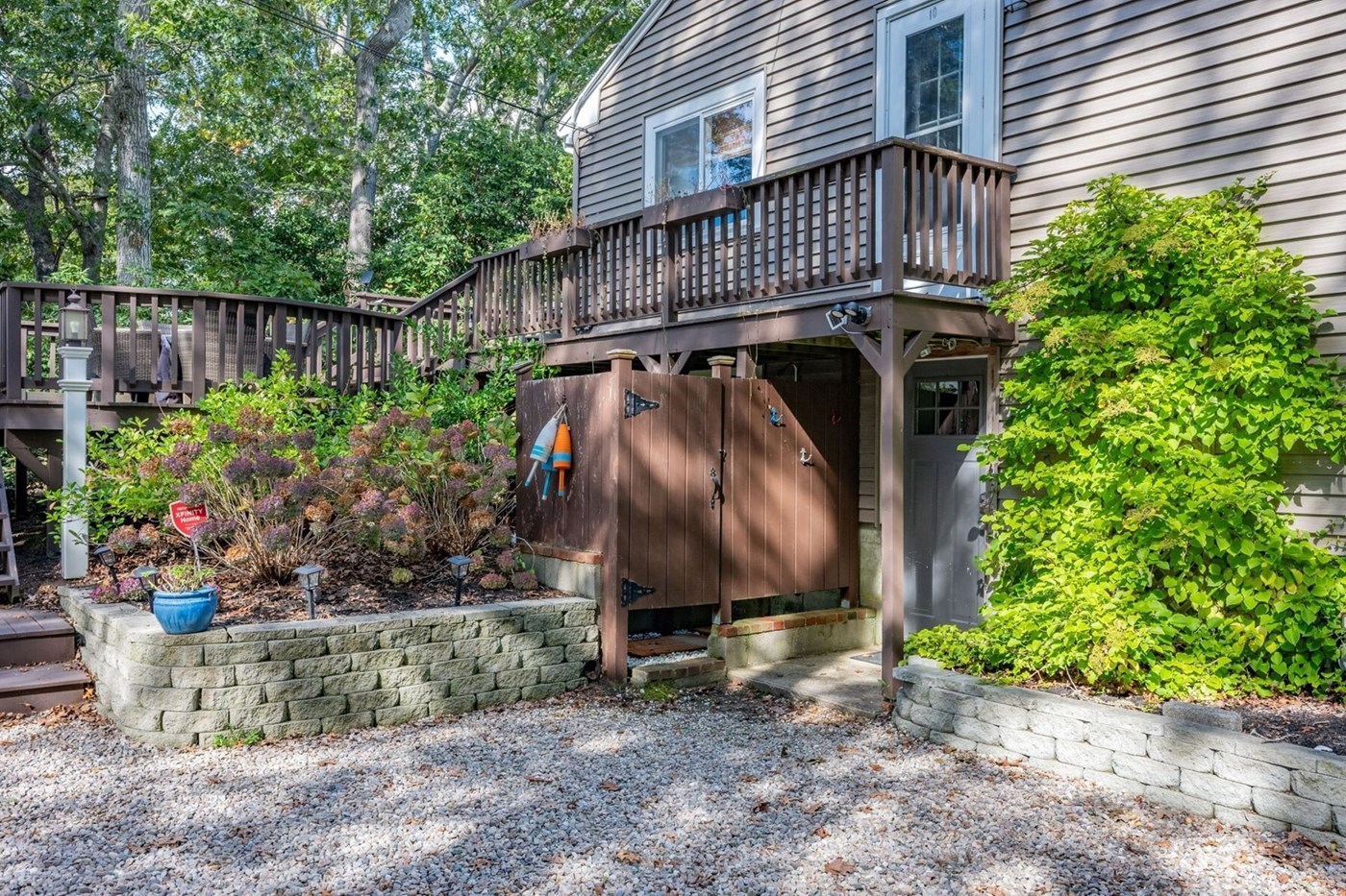 Entry is through the lower level door off of the driveway and next to the outdoor shower