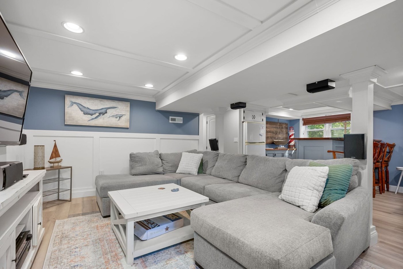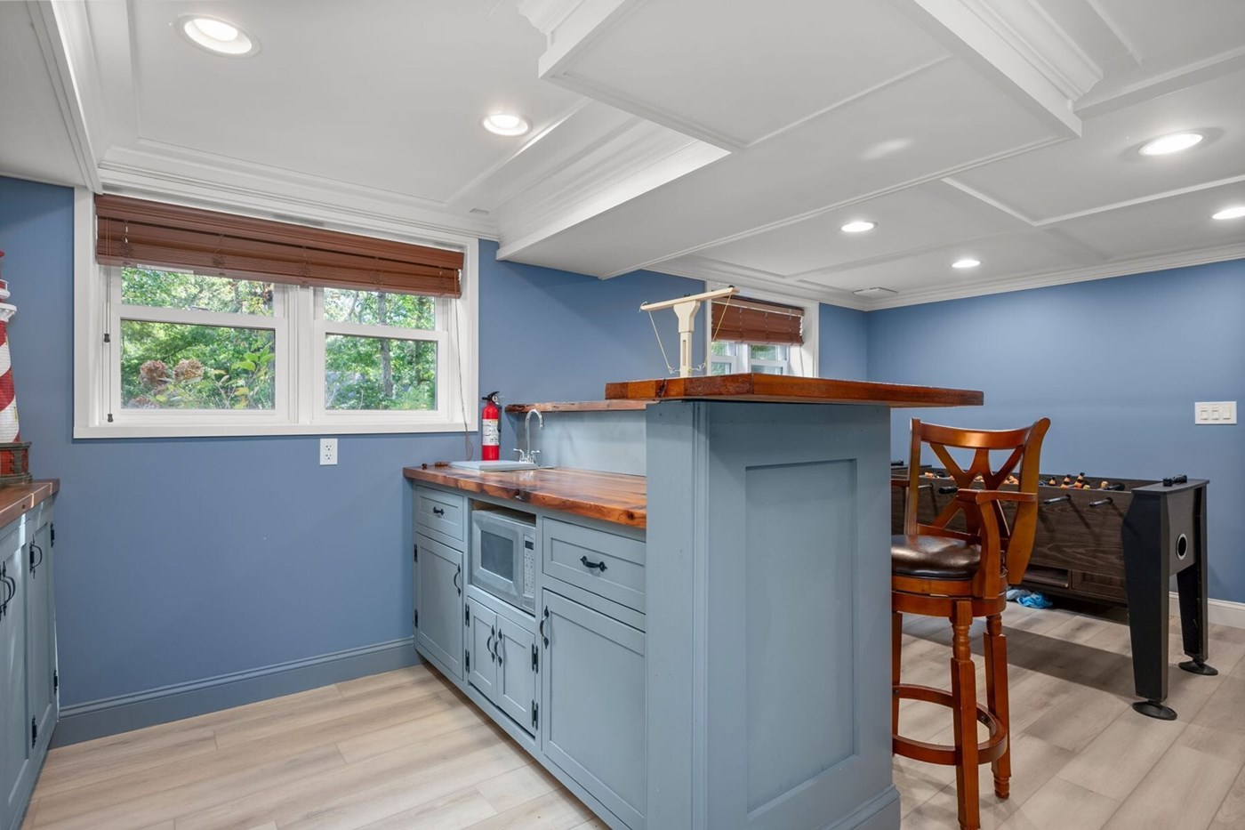 Enjoy the open floorplan of this space with a gaming table and small "bonus" kitchen located next to the living area