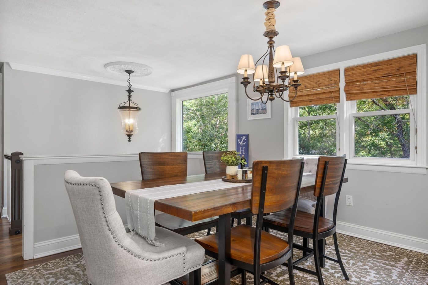 Ascend the stairs, past the formal entry door of the home, to the upper level