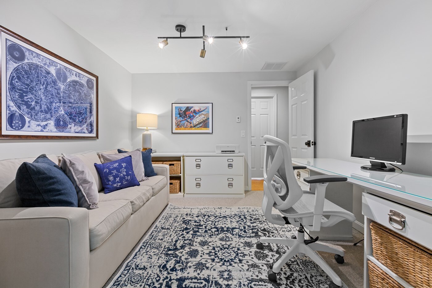 Upon arriving at Mooncusser, you’ll immediately be charmed by its inviting front porch, complete with Adirondack chairs nestled in a garden setting—perfect for unwinding on warm summer afternoons. Inside, the home exudes sophisticated style with a living room that looks straight out of a design magazine. It features elegant furnishings and a 55-inch Frame TV, creating an ideal space for relaxation.