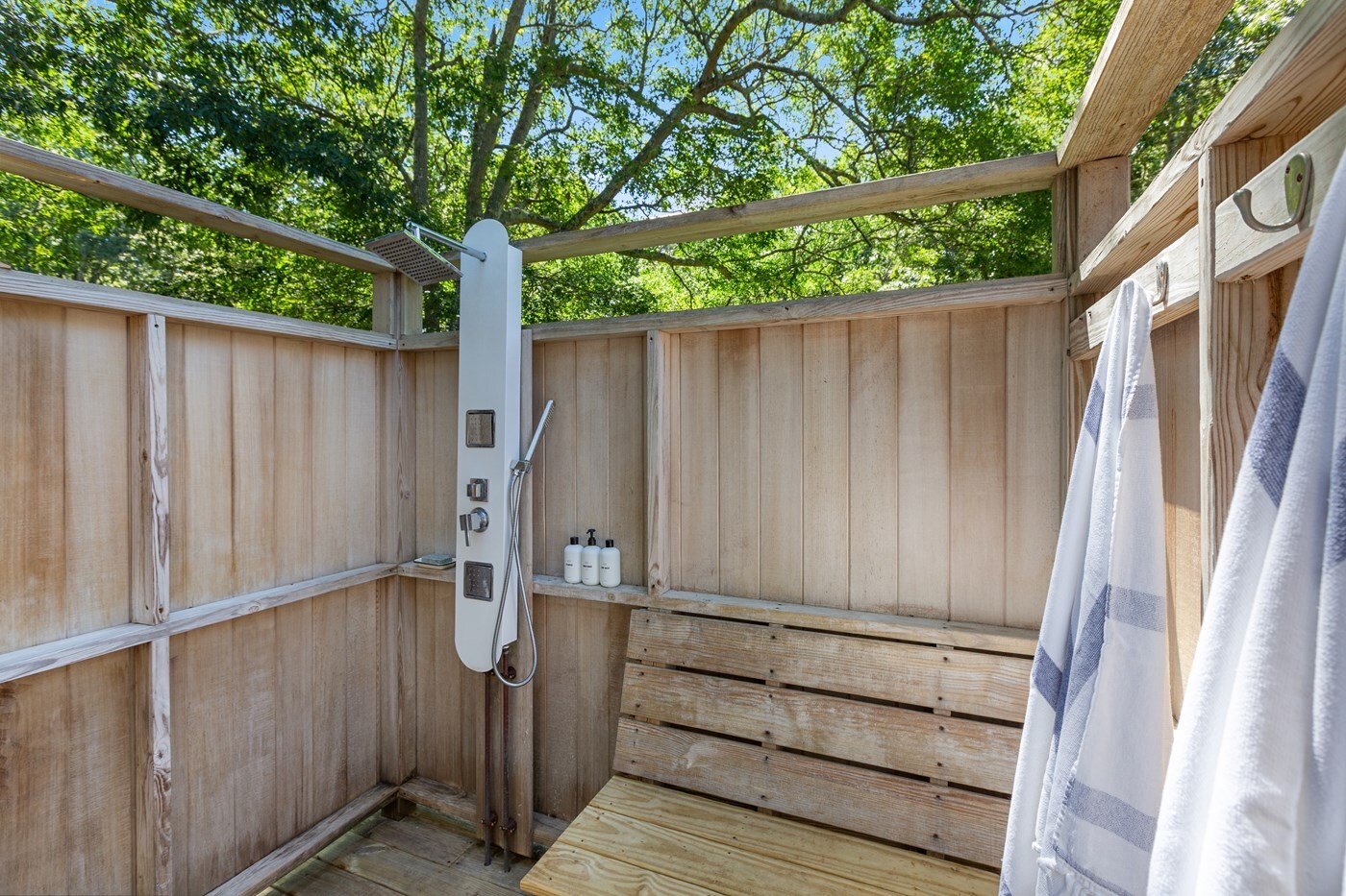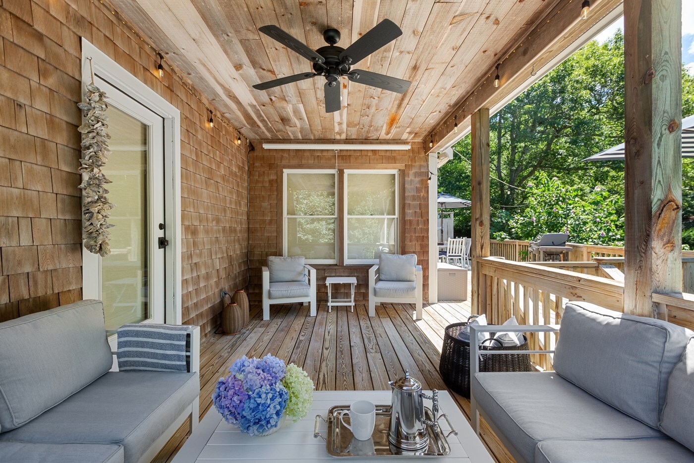 Both the kitchen and family room have direct access to the expansive back deck, where you'll find the ultimate in outdoor living. After a day at the beach, rinse off in the blissful outdoor shower, complete with a rain shower head and massage panel. Enjoy al fresco dining under the umbrella, or relax in the sun on one of the comfy lounge chairs. For evening entertainment, the covered porch offers ample seating and a unique outdoor movie setup, complete with a projector and screen—perfect for cozy nights under the stars.