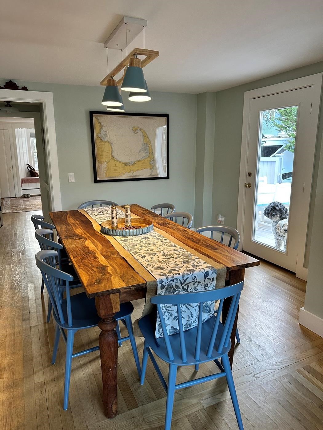 Inside dining room & access to porch with BBQ, table, & fire pit.