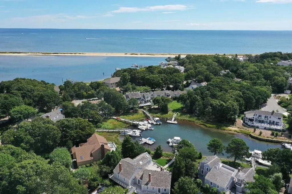Aerial view of home in poppy creek cul-de-sac and barrier beach