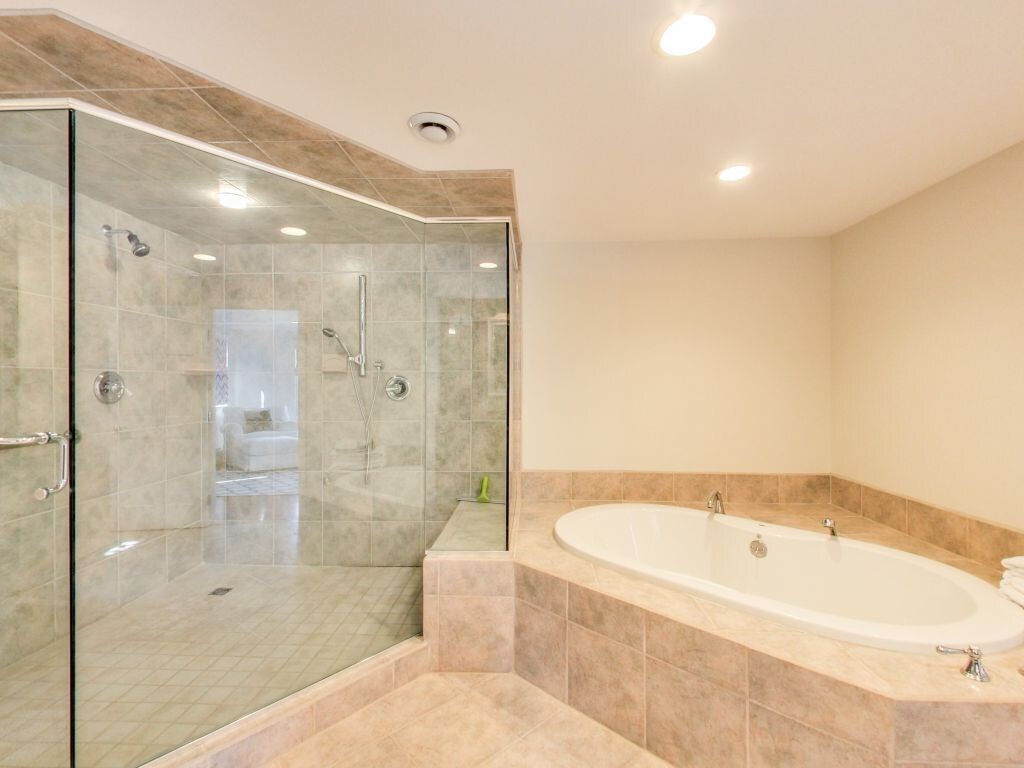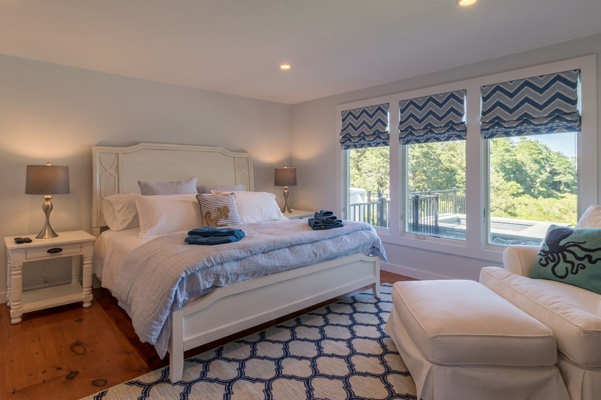 Here is the first floor primary suite with a luxurious king size bed and views of the water.