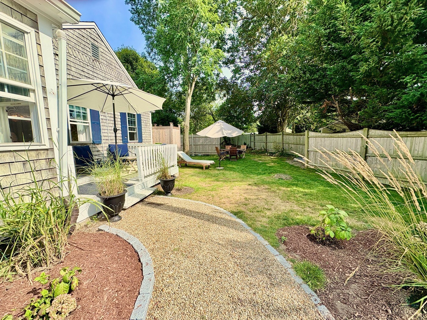 Side of house - porch, outdoor table chairs, BBQ, outdoor shower