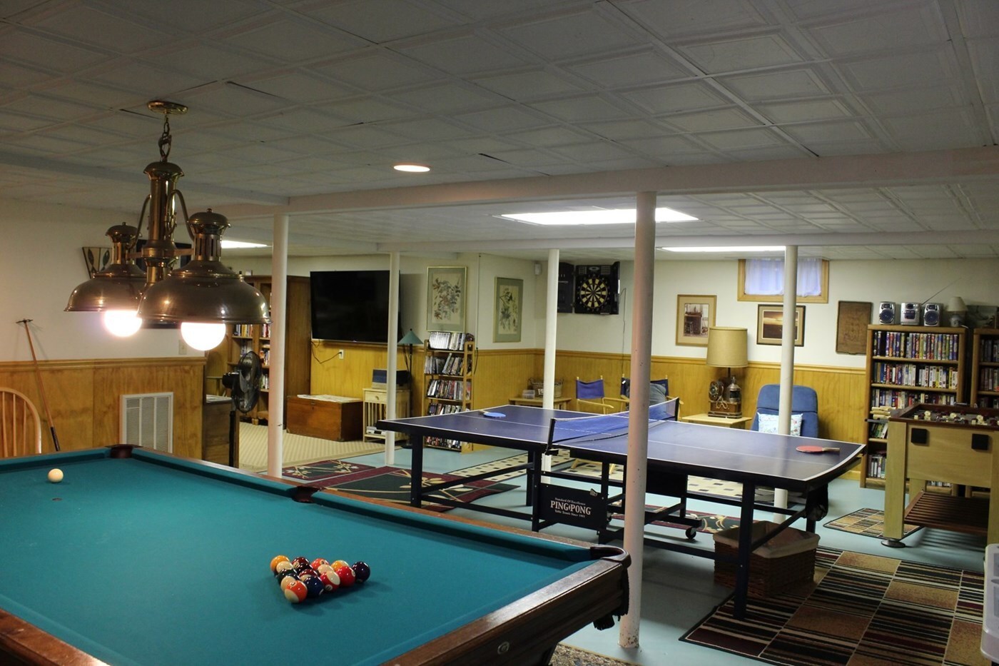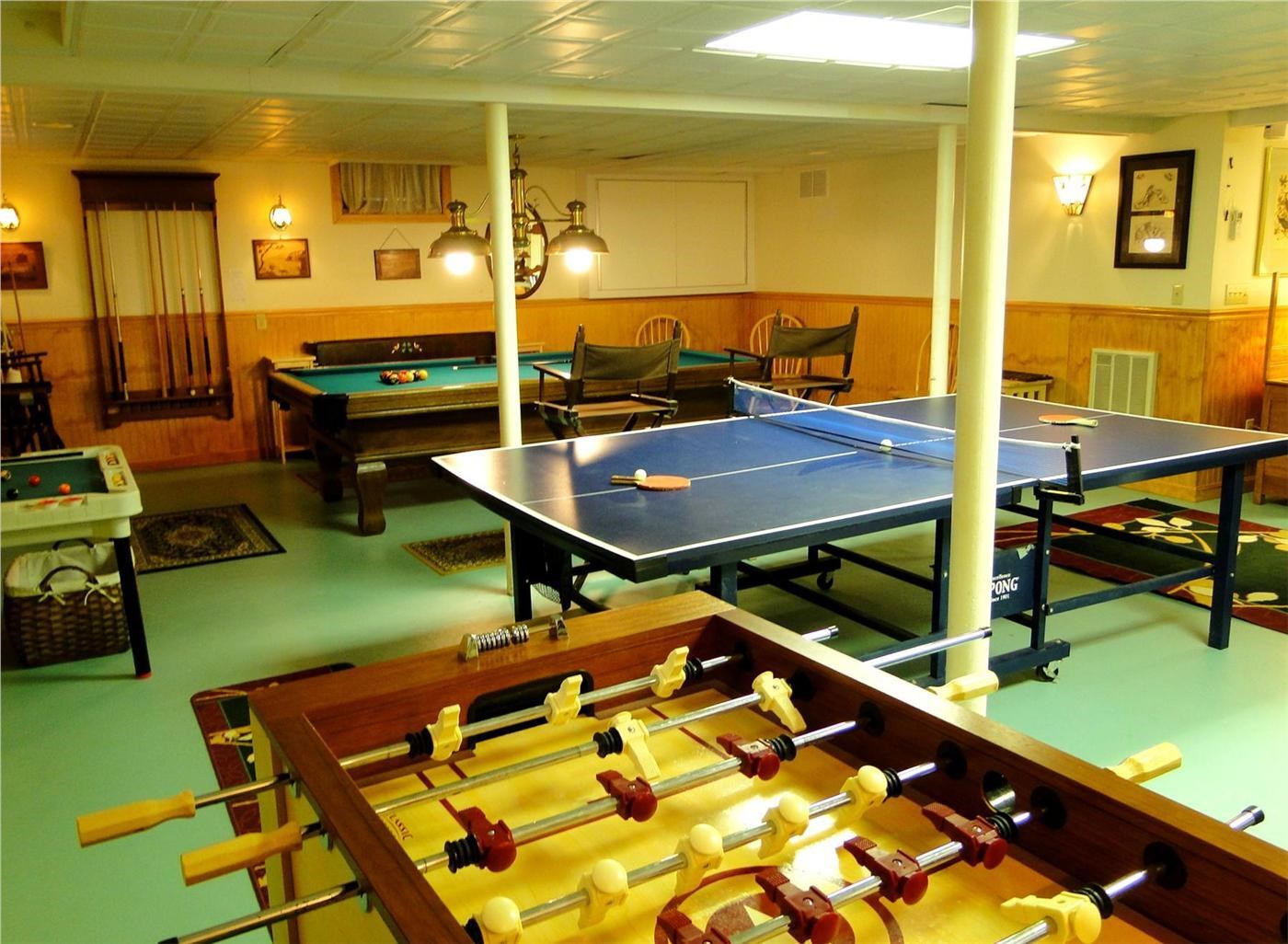 Lower Level 1200 sq ft rec room, equipped with automatic dehumidification system & AC, a 5' x 9' slate, drop-pocket pro pool table, plenty of seating; ping pong table, foosball, dartboard, a Fisher-Price pool table for the little people; satellite smart TV, dvd/dvr, approx. 600 vintage movies for rainy days/fun nights, area for playing cards, games & puzzles, dry bar. Youngsters have a designated play and reading area. Lots of games & books. <br />
