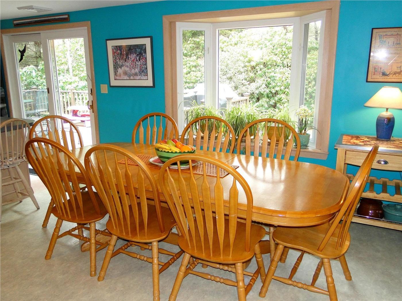 Create delicious recipes in the well-equipped, spacious country kitchen w/breakfast bar for 3, and table for 8, adjacent to bay window, while viewing private wooded setting (see attached videos).<br />