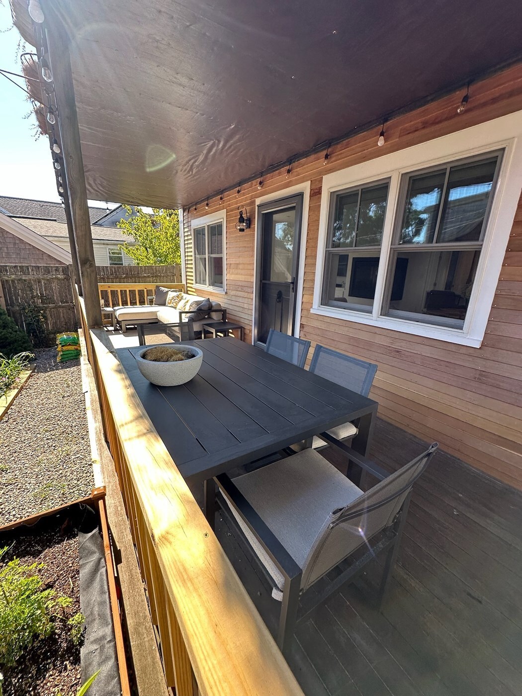 Outdoor dining with 4 chairs; rooftop covered