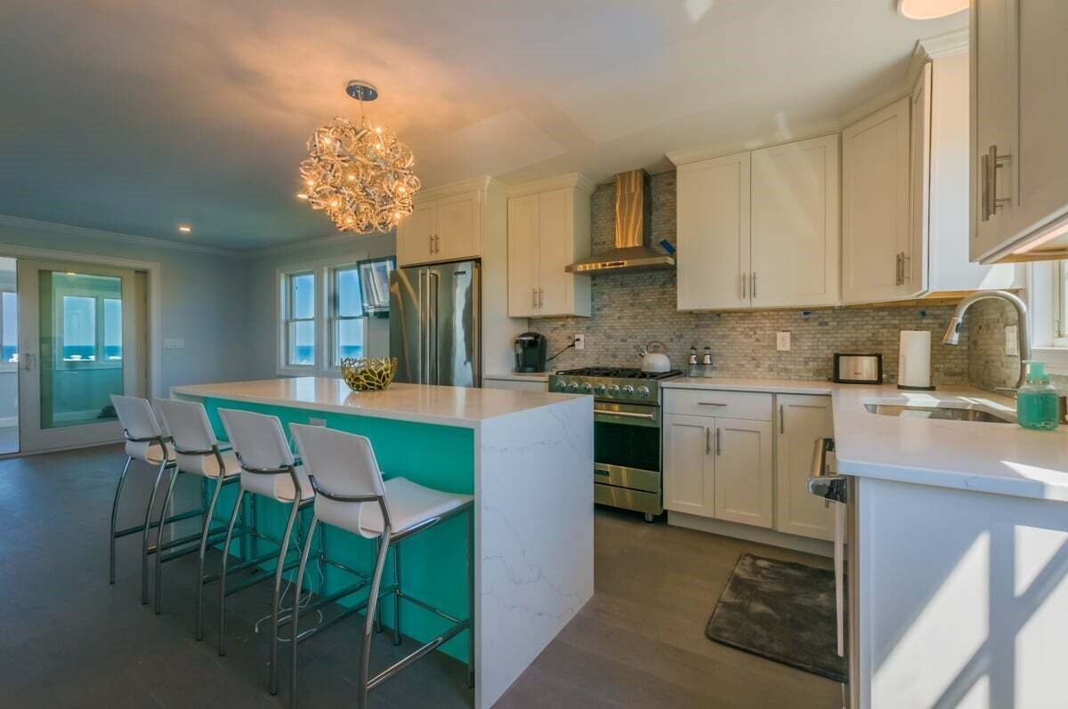 Fully equipped kitchen with guest seating at the island.