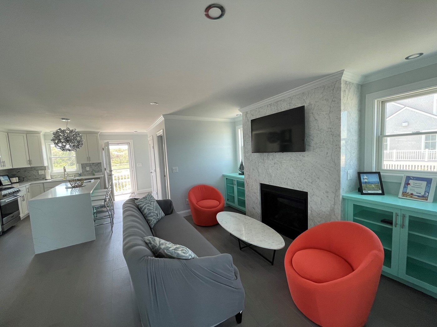 Living area with views of the kitchen.