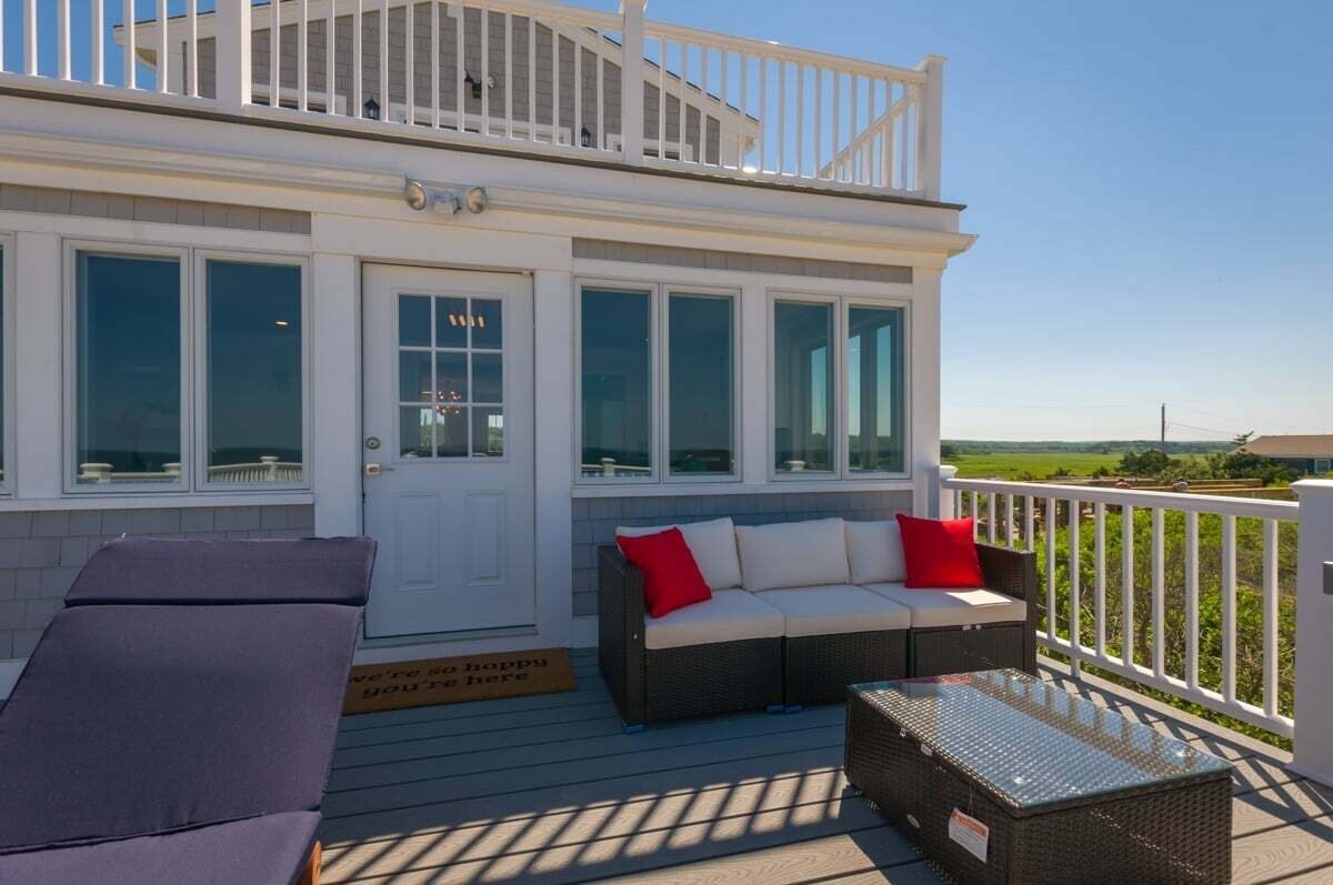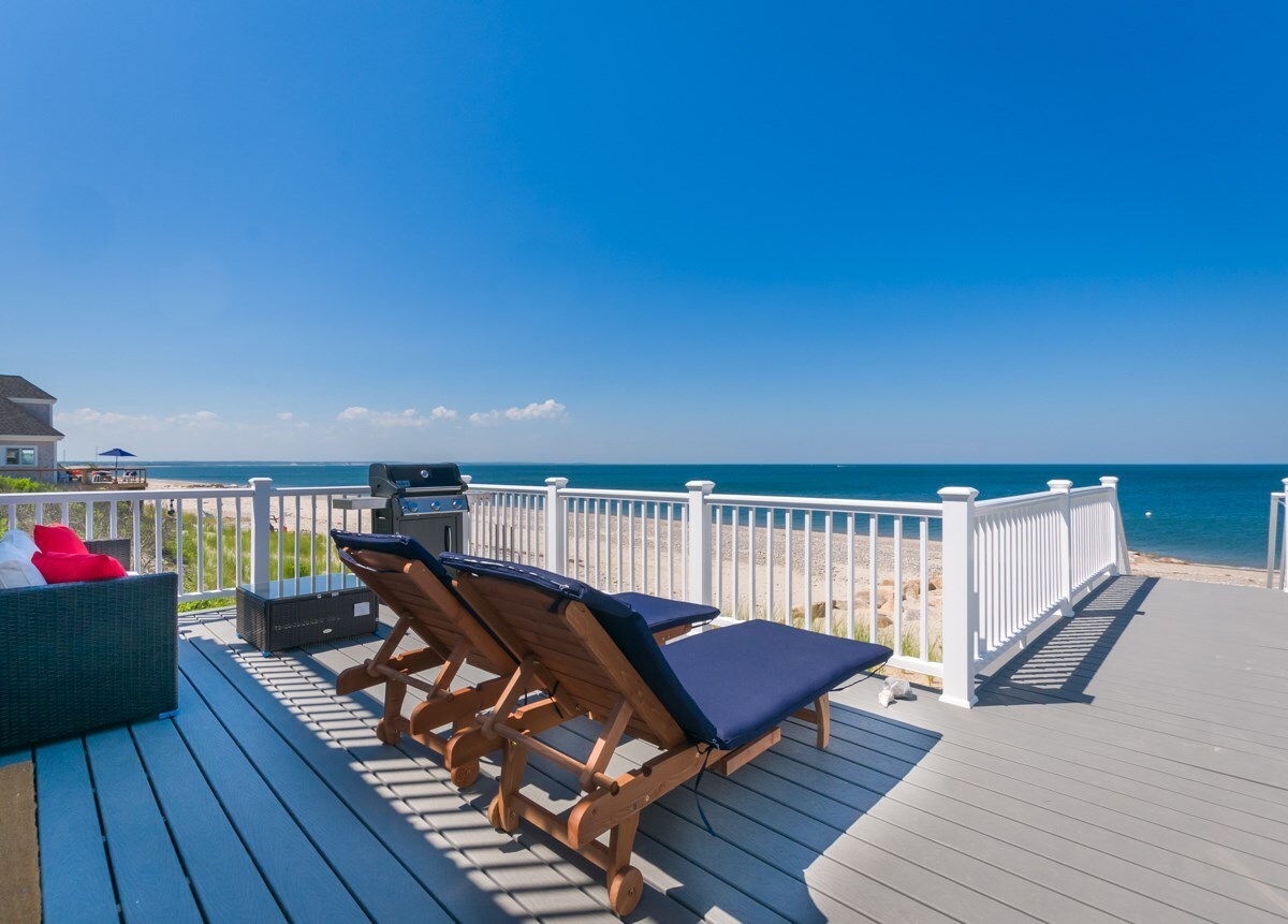 Deck with patio furniture, grill, and private stairway to the beach.