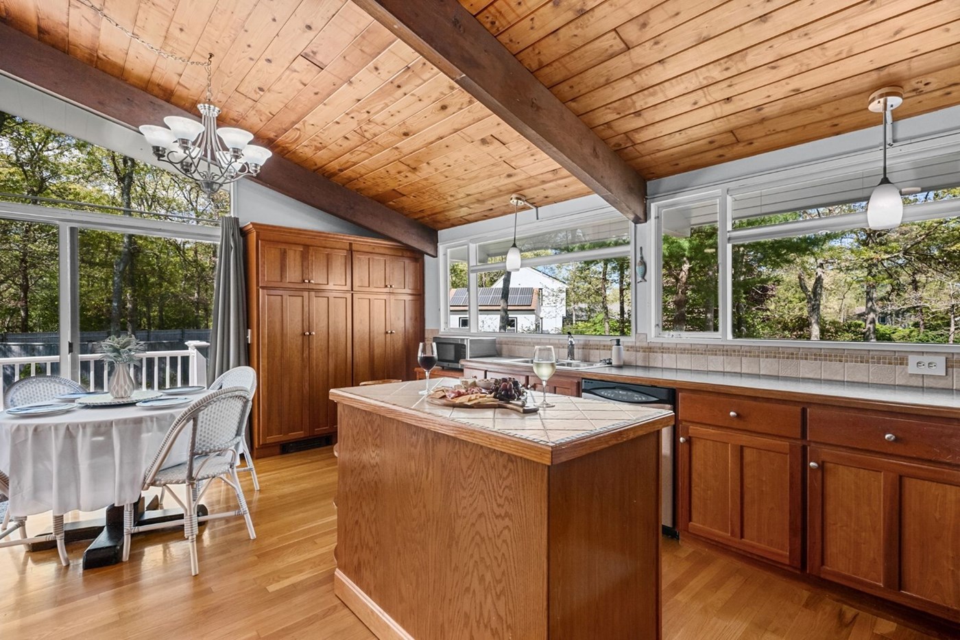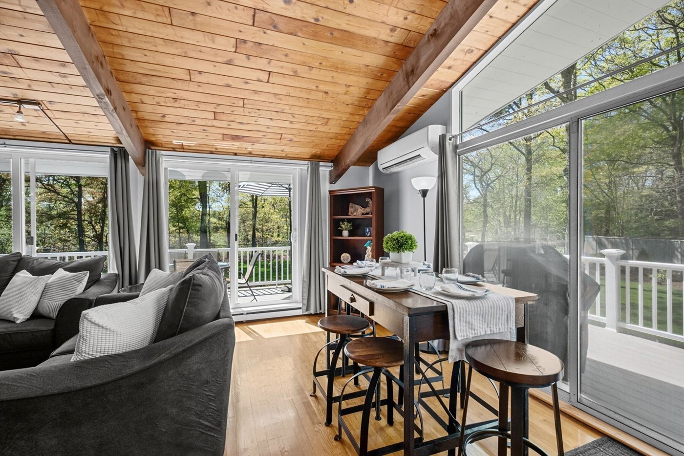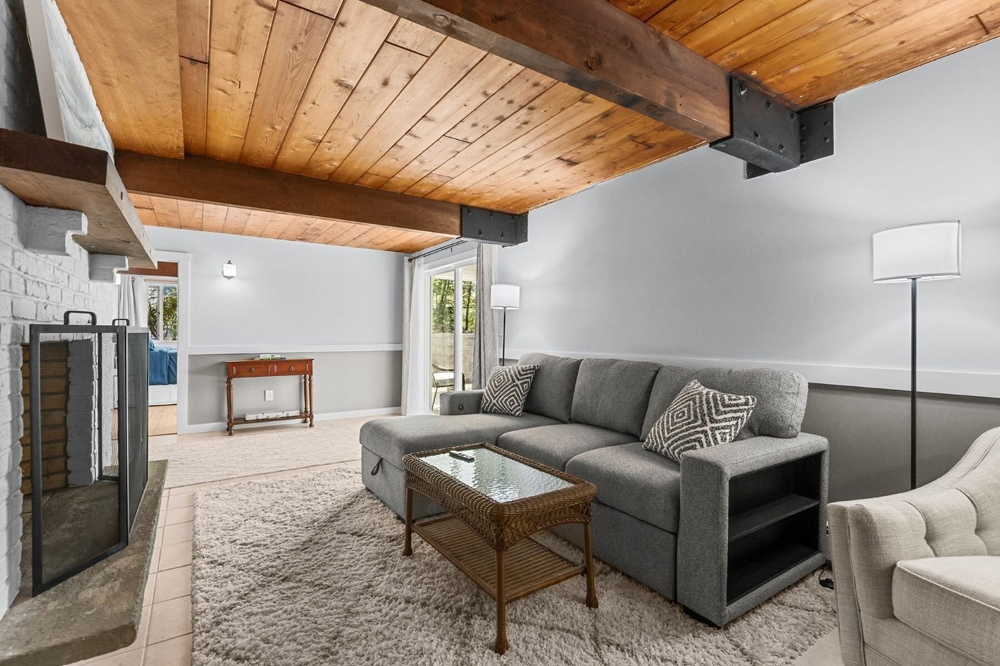 Spacious living room with fireplace (not for guest use) looking into the kitchen