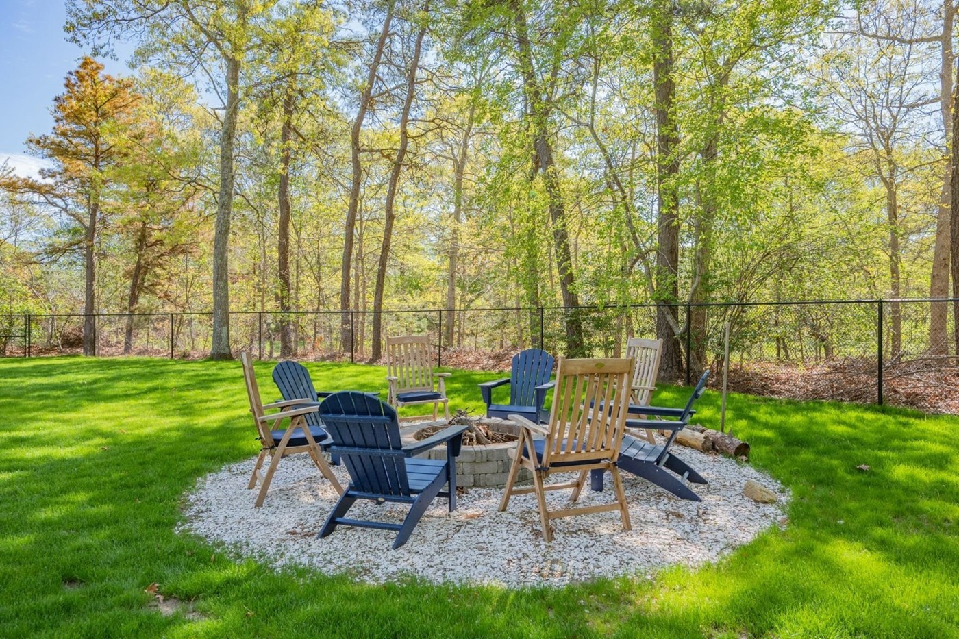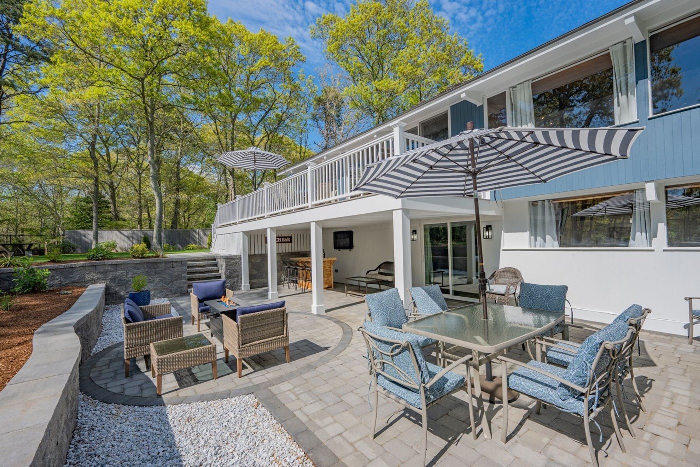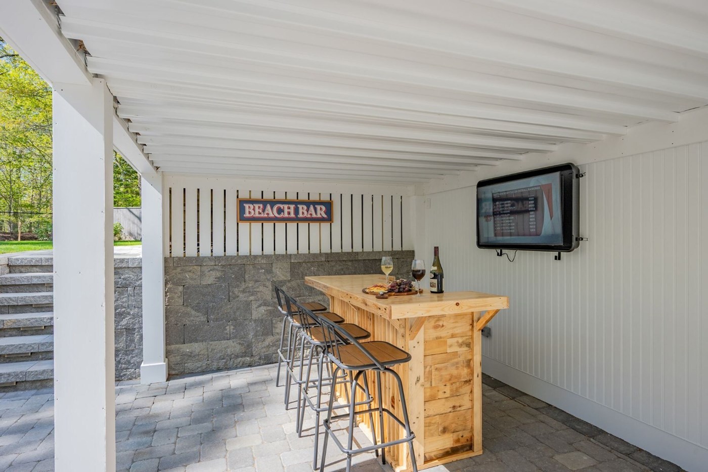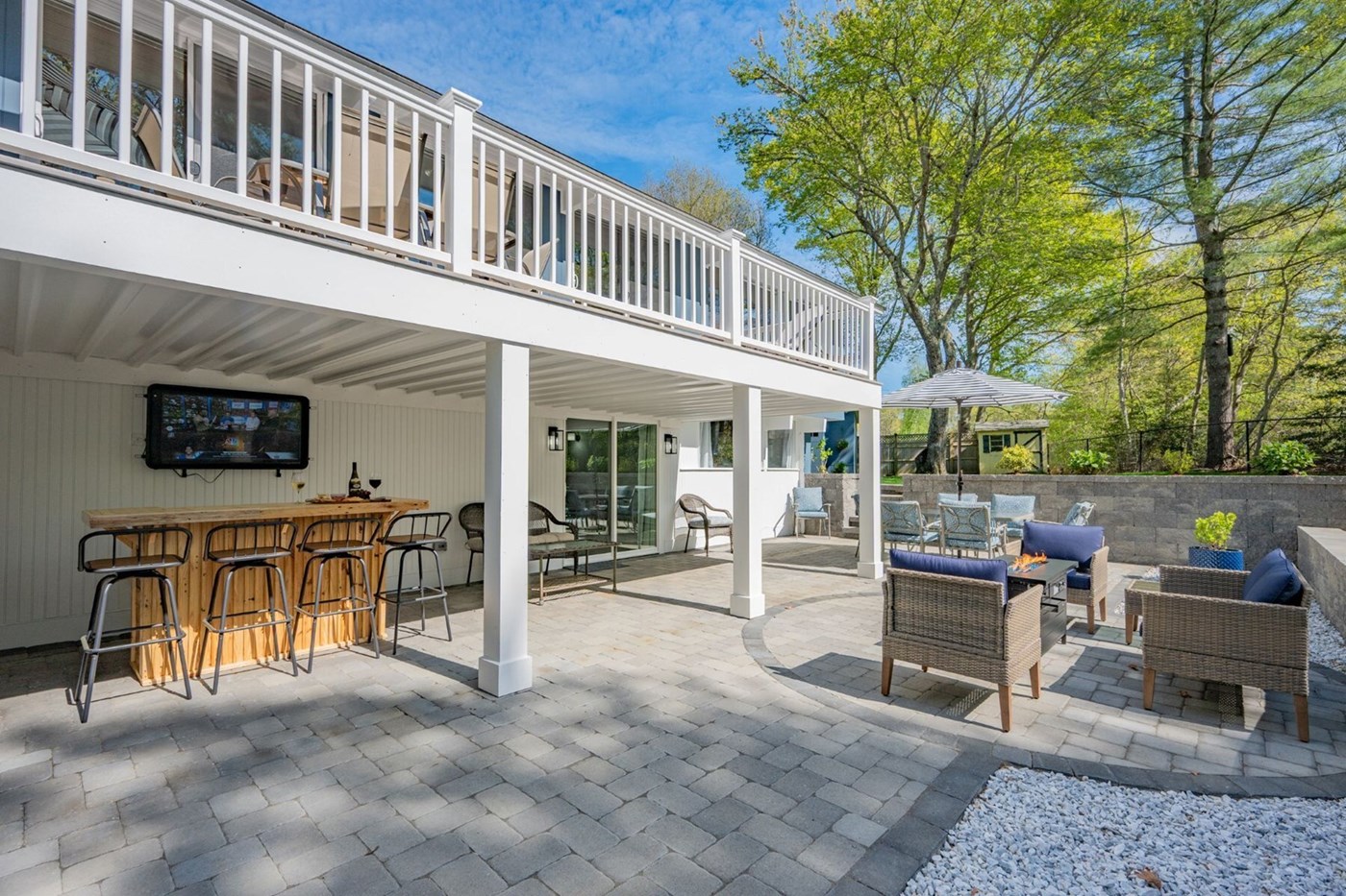 Outdoor patio with outdoor bar, fire pit, and dining area