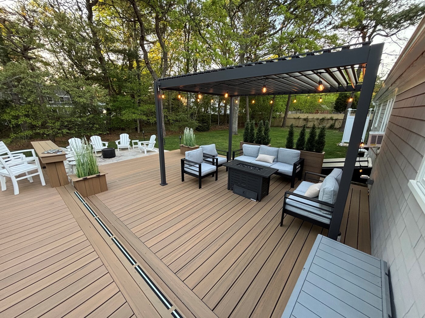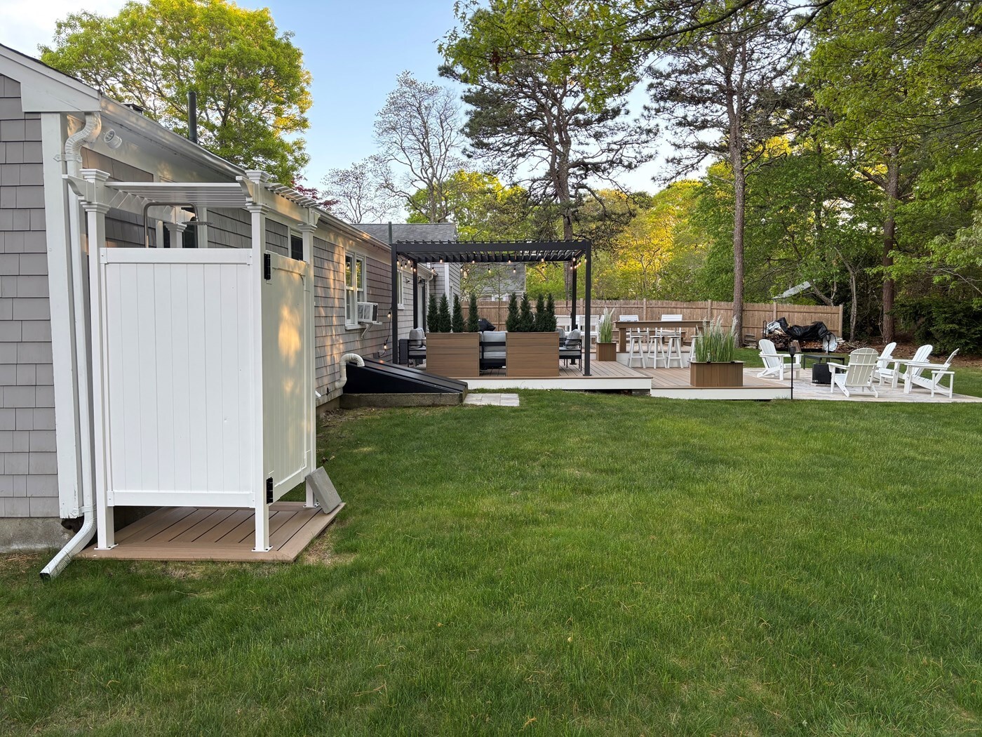 The outdoor space is a true highlight of this property. A giant 24x32-foot deck extends from the family room. It features a large dining table, a lounge area with a propane fireplace, and a 12x10-foot pergola to hang in the shade. Just off the deck is a stone patio with adirondack chairs and a wood fire pit, perfect for evenings under the stars. The large grassy yard, complete with a sprinkler system, provides plenty of room for games and outdoor fun. The outdoor shower is perfect for rinsing off after a day at the beach. Additional amenities include a gas grill, an extra full-size refrigerator in the garage, and a driveway that accommodates 3-4 cars.<br />