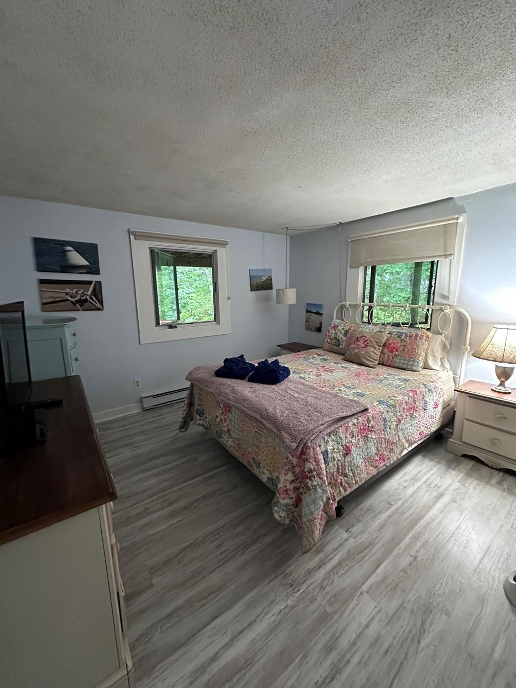 Bedroom with queen bed, two windows, a dresser and a closet.