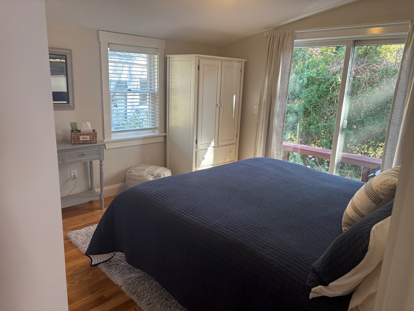 King bedroom on 1st floor with slider to deck and outside shower