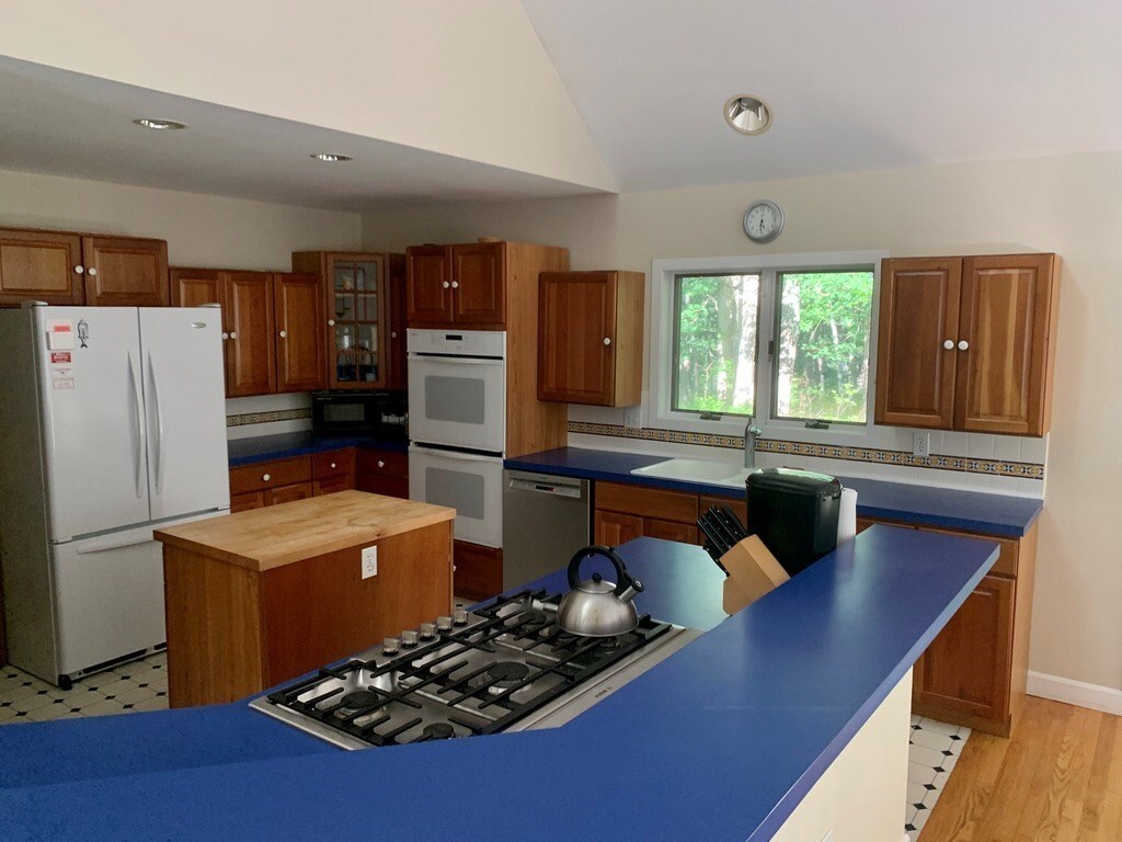 Kitchen features butcher block island, dishwasher, 2 ovens.