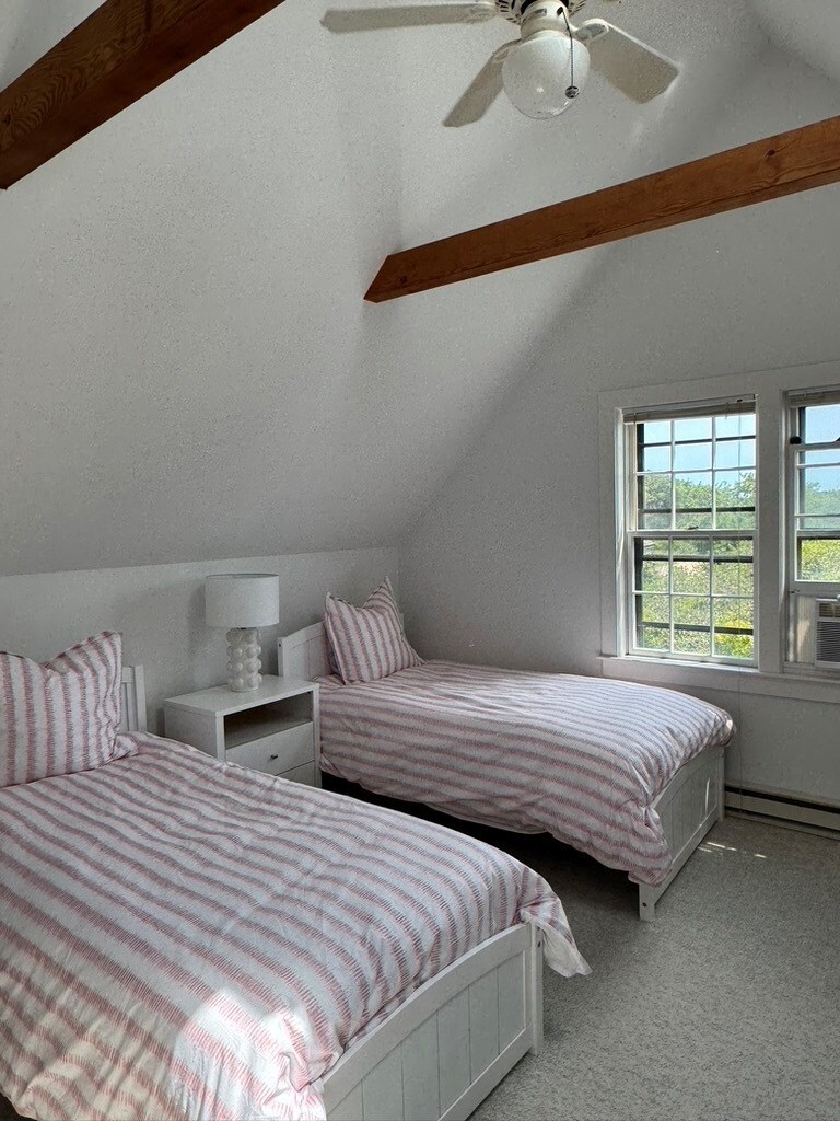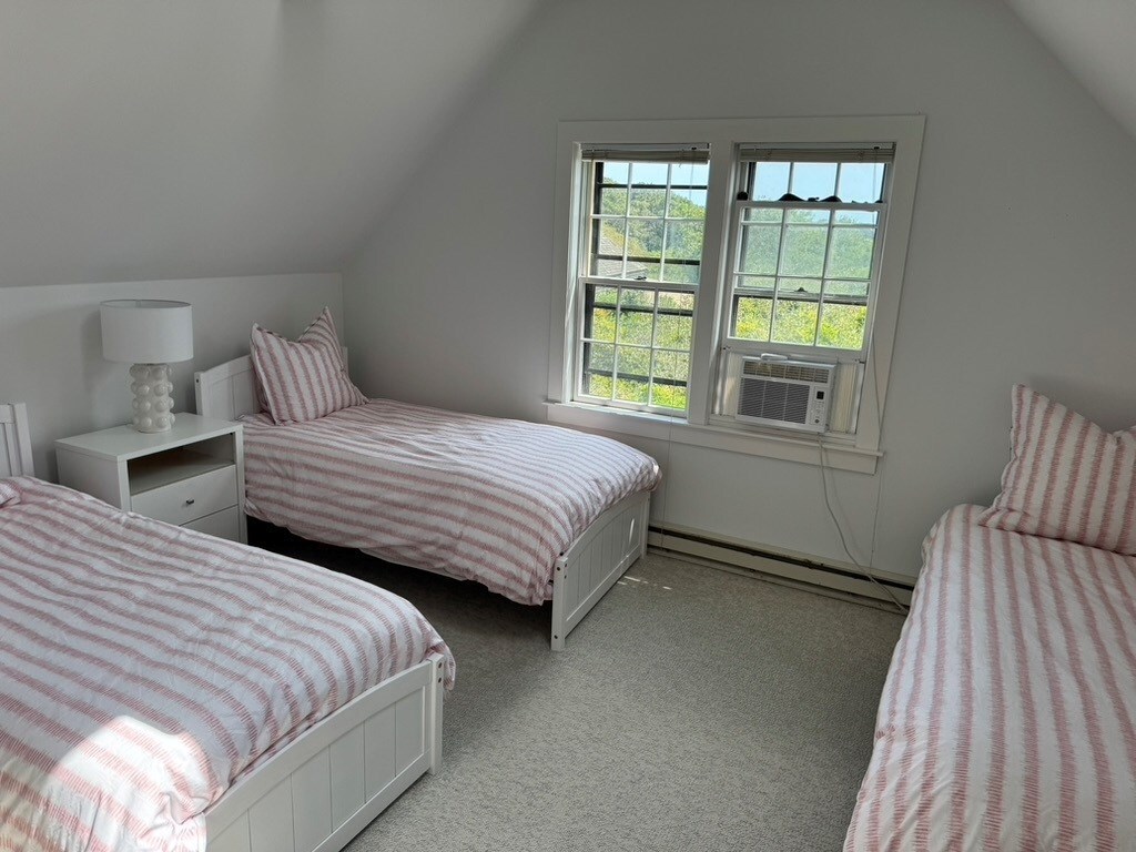 Upstairs bedroom w three single beds, full bath and large closet.